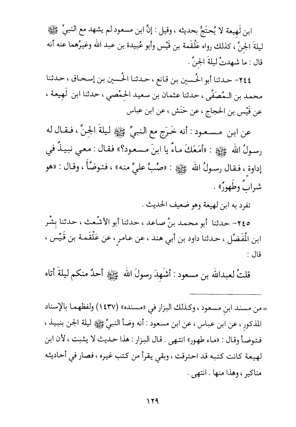 244 - نا أَبُو الْحُسَيْنِ بْنُ قَانِعٍ , نا الْحُسَيْنُ بْنُ إِسْحَاقَ , نا مُحَمَّدُ بْنُ مُصَفًّى , نا عُثْمَانُ بْنُ سَعِيدٍ الْحِمْصِيُّ , نا ابْنُ لَهِيعَةَ , عَنْ قَيْسِ بْنِ الْحَجَّاجِ , عَنْ حَنَشٍ , عَنِ ابْنِ عَبَّاسٍ , عَنِ ابْنِ مَسْعُودٍ , أَنَّهُ خَرَجَ مَعَ النَّبِيِّ صَلَّى اللهُ عَلَيْهِ وَسَلَّمَ لَيْلَةَ الْجِنِّ , فَقَالَ لَهُ رَسُولُ اللَّهِ صَلَّى اللهُ عَلَيْهِ وَسَلَّمَ: «§أَمَعَكَ مَاءٌ يَا ابْنَ مَسْعُودٍ؟» , فَقَالَ: مَعِيَ نَبِيذٌ فِي إِدَاوَةٍ , فَقَالَ رَسُولُ اللَّهِ صَلَّى اللهُ عَلَيْهِ وَسَلَّمَ: «صُبَّ عَلَيَّ مِنْهُ» , فَتَوَضَّأَ , وَقَالَ: «هُوَ شَرَابٌ وَطَهُورٌ». تَفَرَّدَ بِهِ ابْنُ لَهِيعَةَ وَهُوَ ضَعِيفُ الْحَدِيثِ
