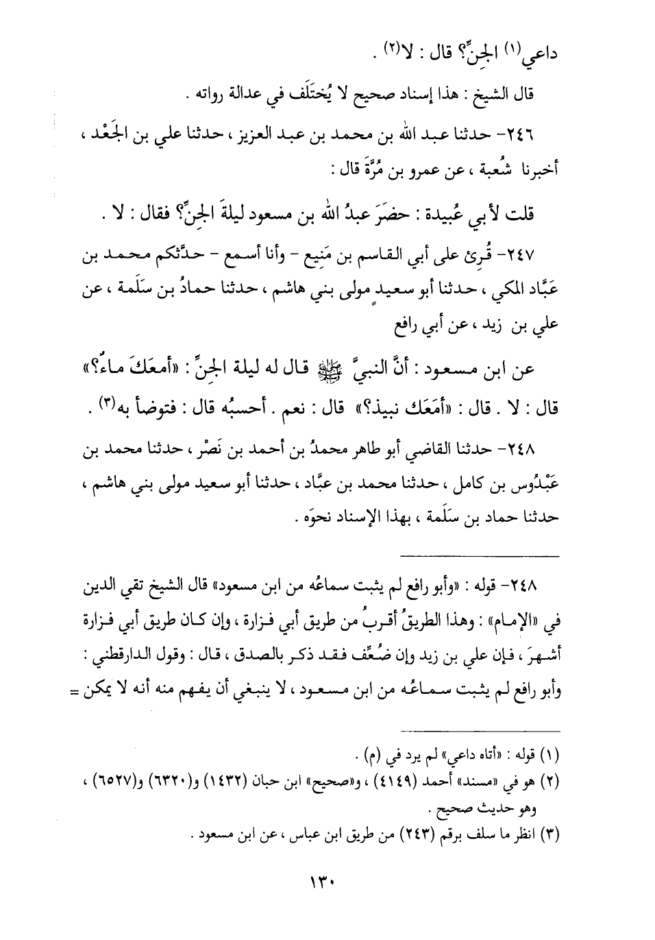 247 - قُرِئَ عَلَى أَبِي الْقَاسِمِ بْنِ مَنِيعٍ وَأَنَا أَسْمَعُ , حَدَّثَكُمْ مُحَمَّدُ بْنُ عَبَّادٍ الْمَكِّيُّ , نا أَبُو سَعِيدٍ مَوْلَى بَنِي هَاشِمٍ , نا حَمَّادُ بْنُ سَلَمَةَ , عَنْ عَلِيِّ بْنِ زَيْدٍ , عَنْ أَبِي رَافِعٍ , عَنِ ابْنِ مَسْعُودٍ أَنَّ النَّبِيَّ صَلَّى اللهُ عَلَيْهِ وَسَلَّمَ قَالَ لَهُ لَيْلَةَ الْجِنِّ: «§أَمَعَكَ مَاءٌ؟» , قَالَ: لَا , قَالَ: «أَمَعَكَ نَبِيذٌ؟ أَحْسَبُهُ» , قَالَ: نَعَمْ , فَتَوَضَّأَ بِهِ. لَا يُثْبَتُ مِنْ وَجْهَيْنِ وَنُكْتَةً ذَكَرْتُهَا فِيهِ