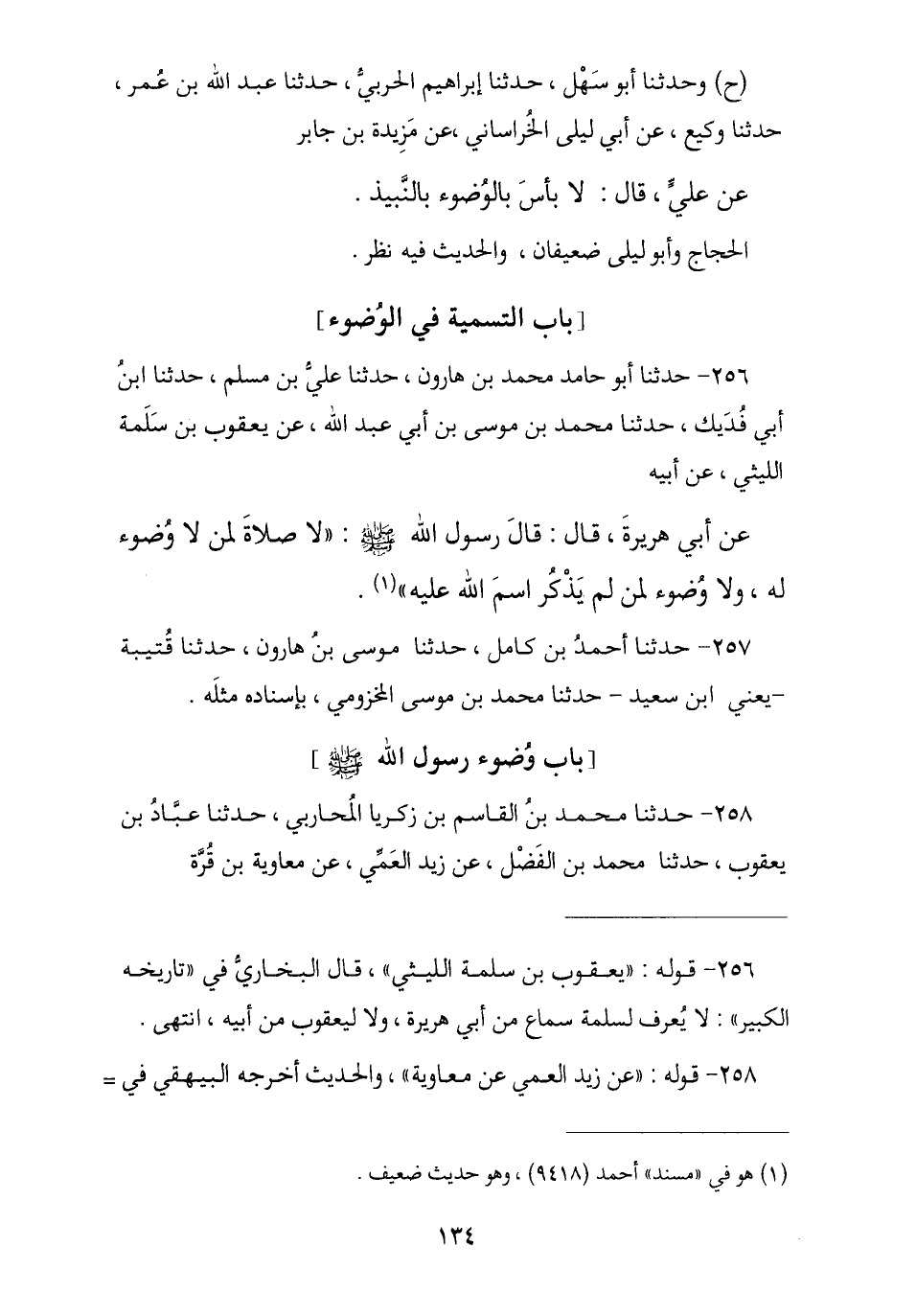 256 - حَدَّثَنَا أَبُو حَامِدٍ مُحَمَّدُ بْنُ هَارُونَ , نا عَلِيُّ بْنُ مُسْلِمٍ , نا ابْنُ أَبِي فُدَيْكٍ , نا مُحَمَّدُ بْنُ مُوسَى بْنِ أَبِي عَبْدِ اللَّهِ , عَنْ يَعْقُوبَ بْنِ سَلَمَةَ اللَّيْثِيِّ , عَنْ أَبِيهِ , عَنْ أَبِي هُرَيْرَةَ , قَالَ: قَالَ رَسُولُ اللَّهِ صَلَّى اللهُ عَلَيْهِ وَسَلَّمَ: «§لَا صَلَاةَ لِمَنْ لَا وُضُوءَ لَهُ , وَلَا وُضُوءَ لِمَنْ لَمْ يَذْكُرِ اسْمَ اللَّهِ عَلَيْهِ».