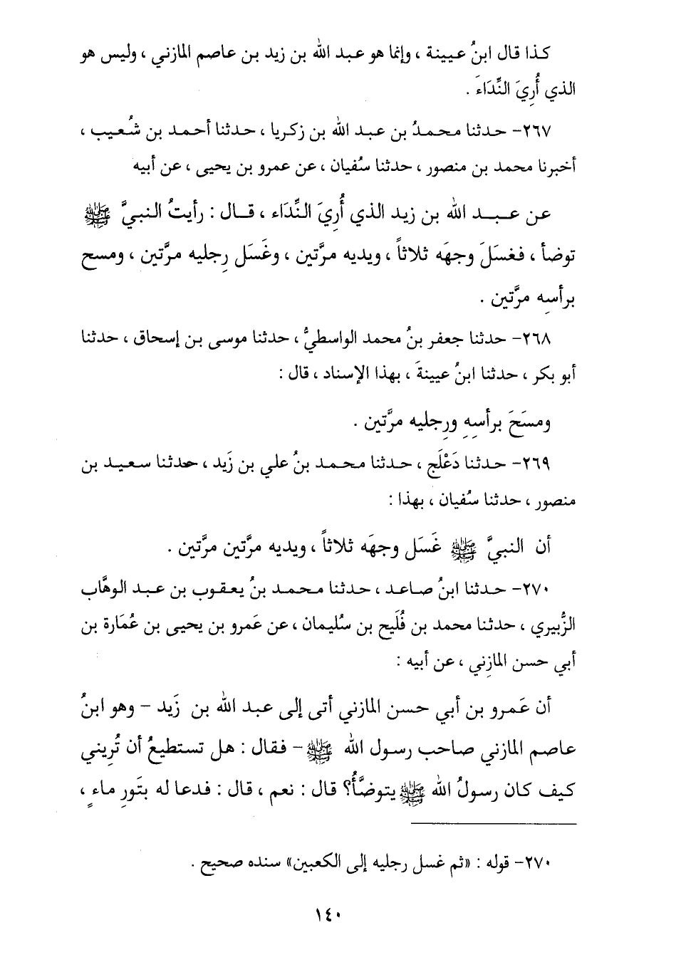 270 - حَدَّثَنَا ابْنُ صَاعِدٍ , نا مُحَمَّدُ بْنُ يَعْقُوبَ بْنِ عَبْدِ الْوَهَّابِ بْنِ يَحْيَى بْنِ عَبَّادِ بْنِ عَبْدِ اللَّهِ بْنِ الزُّبَيْرِ بِالْمَدِينَةِ , حَدَّثَنِي مُحَمَّدُ بْنُ فُلَيْحِ بْنِ سُلَيْمَانَ , عَنْ عَمْرِو بْنِ يَحْيَى بْنِ عُمَارَةَ بْنِ أَبِي حَسَنٍ الْمَازِنِيِّ , عَنْ أَبِيهِ , أَنَّ عَمْرَو بْنَ أَبِي حَسَنٍ الْمَازِنِيَّ , أَتَى إِلَى عَبْدِ اللَّهِ بْنِ زَيْدٍ وَهُوَ ابْنُ عَاصِمٍ الْمَازِنِيُّ صَاحِبُ رَسُولِ اللَّهِ صَلَّى اللهُ عَلَيْهِ وَسَلَّمَ , فَقَالَ: هَلْ تَسْتَطِيعُ أَنْ تُرِيَنِي كَيْفَ كَانَ رَسُولُ اللَّهِ صَلَّى اللهُ عَلَيْهِ وَسَلَّمَ يَتَوَضَّأُ؟ , قَالَ: «نَعَمْ» , §فَدَعَا لَهُ بِتَوْرِ مَاءٍ , -[141]- فَأَكْفَأَ التَّوْرَ عَلَى يَدِهِ الْيُمْنَى فَغَسَلَ يَدَهُ الْيُمْنَى ثَلَاثَ مَرَّاتٍ , يُكْفِيءُ التَّوْرَ عَلَى يَدَيْهِ ثُمَّ يَغْسِلُ يَدَيْهِ ثَلَاثَ مَرَّاتٍ , ثُمَّ أَدْخَلَ يَدَيْهِ فِي التَّوْرِ فَغَرَفَ غَرْفَةً مِنْ مَاءٍ وَمَضْمَضَ وَاسْتَنْشَقَ , ثُمَّ اسْتَنْثَرَ ثَلَاثَ غَرَفَاتٍ ثُمَّ غَسَلَ وَجْهَهُ ثَلَاثَ مَرَّاتٍ , ثُمَّ غَسَلَ كُلَّ يَدٍ مَرَّتَيْنِ إِلَى الْمِرْفَقِ , ثُمَّ أَخَذَ مِنَ الْمَاءِ فَمَسَحَ بِرَأْسِهِ أَقْبَلَ بِهِمَا وَأَدْبَرَ , ثُمَّ غَسَلَ رِجْلَيْهِ إِلَى الْكَعْبَيْنِ "