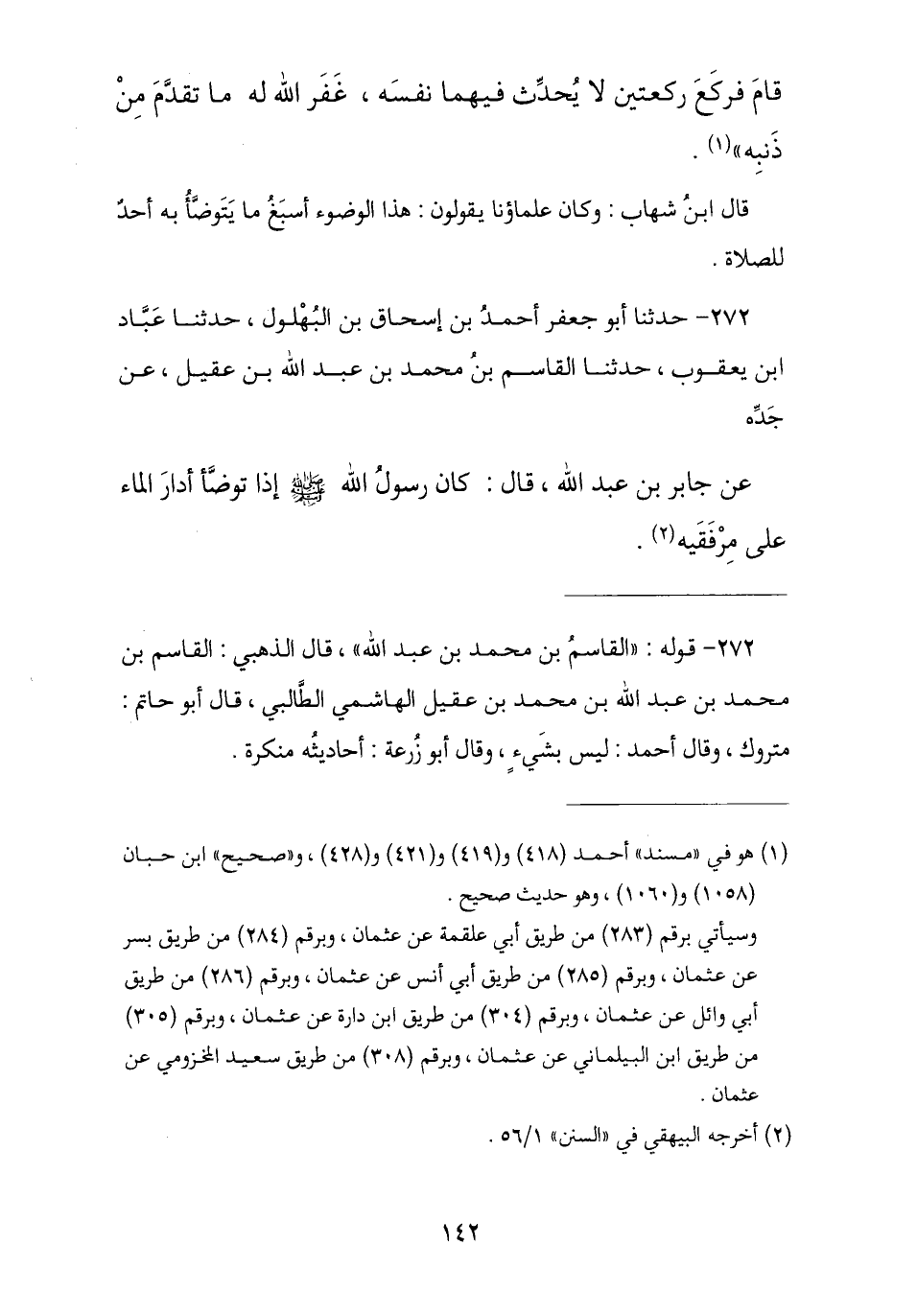 272 - حَدَّثَنَا أَبُو جَعْفَرٍ أَحْمَدُ بْنُ إِسْحَاقَ بْنِ الْبُهْلُولِ , نا عَبَّادُ بْنُ يَعْقُوبَ , نا الْقَاسِمُ بْنُ مُحَمَّدِ بْنِ عَبْدِ اللَّهِ بْنِ عَقِيلٍ , عَنْ جَدِّهِ , عَنْ جَابِرِ بْنِ عَبْدِ اللَّهِ , قَالَ: كَانَ رَسُولُ اللَّهِ صَلَّى اللهُ عَلَيْهِ وَسَلَّمَ § «إِذَا تَوَضَّأَ أَدْارَ الْمَاءَ عَلَى مِرْفَقَيْهِ». ابْنُ عَقِيلٍ لَيْسَ بِقَوِيٍّ