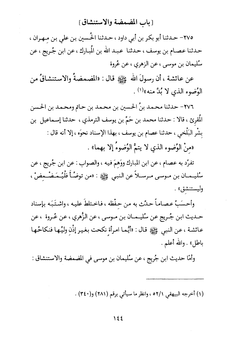 275 - حَدَّثَنَا أَبُو بَكْرِ بْنُ أَبِي دَاوُدَ , ثنا الْحُسَيْنُ بْنُ عَلِيِّ بْنِ مِهْرَانَ , نا عِصَامُ بْنُ يُوسُفَ , نا عَبْدُ اللَّهِ بْنُ الْمُبَارَكِ , عَنِ ابْنِ جُرَيْجٍ , عَنْ سُلَيْمَانَ بْنِ مُوسَى , عَنِ الزُّهْرِيِّ , عَنْ عُرْوَةَ , عَنْ عَائِشَةَ , أَنَّ رَسُولَ اللَّهِ صَلَّى اللهُ عَلَيْهِ وَسَلَّمَ قَالَ: § «الْمَضْمَضَةُ وَالِاسْتِنْشَاقُ مِنَ الْوُضُوءِ الَّذِي لَا بُدَّ مِنْهُ».