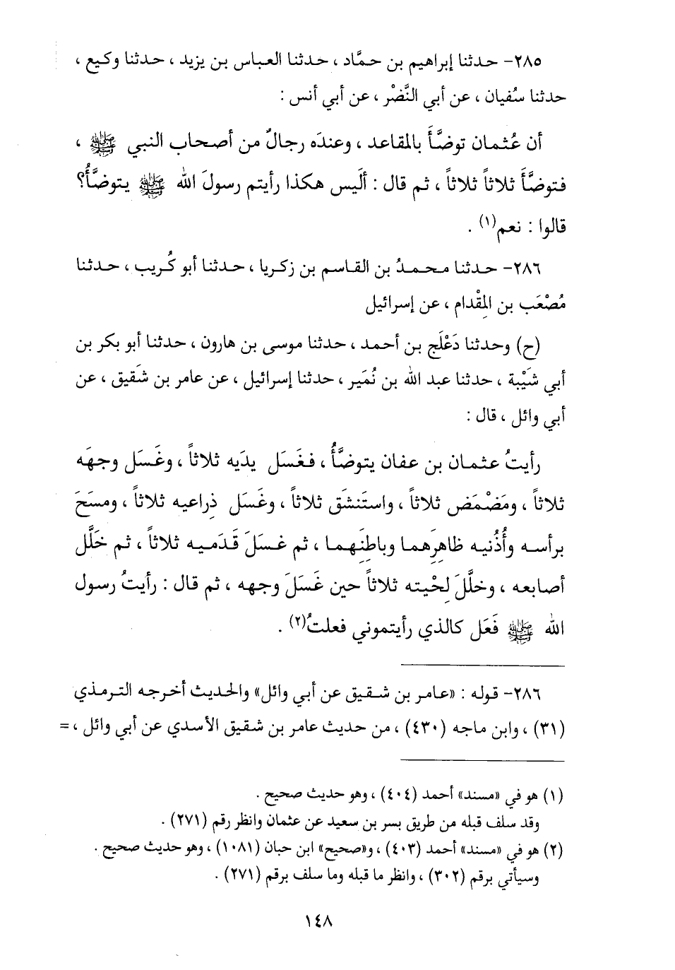 285 - حَدَّثَنَا إِبْرَاهِيمُ بْنُ حَمَّادٍ , نا الْعَبَّاسُ بْنُ يَزِيدَ , ثنا وَكِيعٌ , نا سُفْيَانُ , عَنْ أَبِي النَّضْرِ , عَنْ أَبِي أَنَسٍ , أَنَّ عُثْمَانَ §تَوَضَّأَ بِالْمَقَاعِدِ وَعِنْدَهُ رِجَالٌ مِنْ أَصْحَابِ النَّبِيِّ صَلَّى اللهُ عَلَيْهِ وَسَلَّمَ فَتَوَضَّأَ ثَلَاثًا , ثُمَّ قَالَ: أَلَيْسَ هَكَذَا رَأَيْتُمْ رَسُولَ اللَّهِ صَلَّى اللهُ عَلَيْهِ وَسَلَّمَ يَتَوَضَّأُ؟ , قَالُوا: نَعَمْ. وَتَابَعَهُ أَبُو أَحْمَدَ الزُّبَيْرِيُّ , عَنِ الثَّوْرِيِّ. وَالصَّوَابُ عَنِ الثَّوْرِيِّ , عَنْ أَبِي النَّضْرِ , عَنْ بُسْرٍ , عَنْ عُثْمَانَ