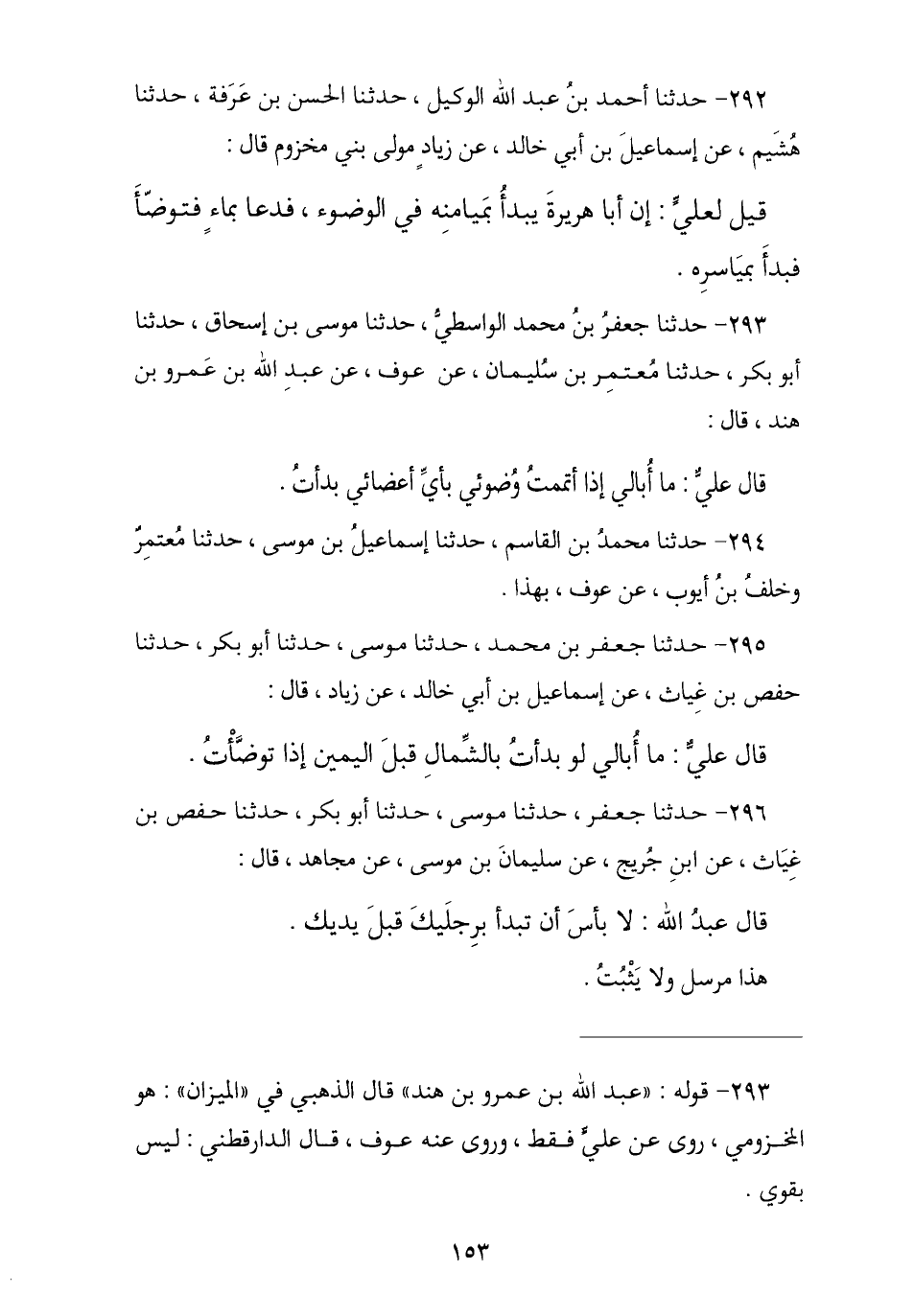293 - نا جَعْفَرُ بْنُ مُحَمَّدٍ الْوَاسِطِيُّ , نا مُوسَى بْنُ إِسْحَاقَ , نا أَبُو بَكْرٍ , نا مُعْتَمِرُ بْنُ سُلَيْمَانَ , عَنْ عَوْفٍ , عَنْ عَبْدِ اللَّهِ بْنِ عَمْرِو بْنِ هِنْدَ , قَالَ: قَالَ عَلِيٌّ عَلَيْهِ السَّلَامُ: § «مَا أُبَالِي إِذَا أَتْمَمْتُ وُضُوئِي بِأَيِّ أَعْضَائِي بَدَأْتُ».
