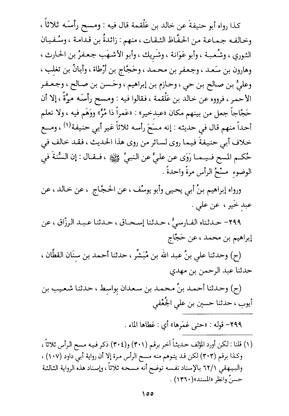299 - حَدَّثَنَا الْفَارِسِيُّ ثنا إِسْحَاقُ , نا عَبْدُ الرَّزَّاقِ , عَنْ إِبْرَاهِيمَ بْنِ مُحَمَّدٍ , عَنْ حَجَّاجٍ , وَثنا عَلِيُّ بْنُ عَبْدِ اللَّهِ بْنِ مُبَشِّرٍ , نا أَحْمَدُ بْنُ سِنَانٍ الْقَطَّانُ , نا عَبْدُ الرَّحْمَنِ بْنُ مَهْدِيٍّ , وَثنا أَحْمَدُ بْنُ مُحَمَّدِ بْنِ سَعْدَانَ بِوَاسِطَ , نا شُعَيْبُ بْنُ أَيُّوبَ , ثنا حُسَيْنُ بْنُ عَلِيٍّ الْجُعْفِيُّ , -[156]- وَثنا يَعْقُوبُ بْنُ إِبْرَاهِيمَ الْبَزَّازُ , ثنا جَعْفَرُ بْنُ مُحَمَّدِ بْنِ فُضَيْلٍ الرَّاسِبِيُّ , نا الْوَلِيدُ , وَيَحْيَى بْنُ أَبِي بَكْرٍ , قَالُوا: نا زَائِدَةُ , نا خَالِدُ بْنُ عَلْقَمَةَ , حَدَّثَنِي عَبْدُ خَيْرٍ , قَالَ: جَلَسَ عَلِيُّ رَضِيَ اللَّهُ عَنْهُ بَعْدَ مَا صَلَّى الْفَجْرَ فِي الرَّحَبَةِ , ثُمَّ قَالَ لِغُلَامِهِ: § «ائْتِنِي بِطَهُورٍ» , فَأَتَاهُ الْغُلَامُ بِإِنَاءٍ فِيهِ مَاءٌ , وَطَسْتٍ وَنَحْنُ نَنْظُرُ إِلَيْهِ فَأَخَذَ بِيَمِينِهِ الْإِنَاءَ فَأَكْفَأَهُ عَلَى يَدِهِ الْيُسْرَى , ثُمَّ غَسَلَ كَفَّيْهِ ثُمَّ أَخَذَ بِيَدِهِ الْيُمْنَى الْإِنَاءَ فَأَفْرَغَ عَلَى يَدِهِ الْيُسْرَى , ثُمَّ غَسَلَ كَفَّيْهِ فَعَلَهُ ثَلَاثَ مَرَّاتٍ - قَالَ عَبْدُ خَيْرٍ: كُلُّ ذَلِكَ لَا يُدْخِلُ يَدَهُ فِي الْإِنَاءِ حَتَّى يَغْسِلَهَا ثَلَاثَ مَرَّاتٍ - ثُمَّ أَدْخَلَ يَدَهُ الْيُمْنَى فِي الْإِنَاءِ فَمَضْمَضَ وَاسْتَنْشَقَ وَنَثَرَ بِيَدِهِ الْيُسْرَى فَعَلَ ذَلِكَ ثَلَاثَ مَرَّاتٍ , ثُمَّ أَدْخَلَ يَدَهُ الْيُمْنَى فِي الْإِنَاءِ فَغَسَلَ وَجْهَهُ ثَلَاثَ مَرَّاتٍ , ثُمَّ غَسَلَ يَدَهُ الْيُمْنَى إِلَى الْمِرْفَقِ ثَلَاثَ مَرَّاتٍ , ثُمَّ غَسَلَ يَدَهُ الْيُسْرَى إِلَى الْمِرْفَقِ ثَلَاثَ مَرَّاتٍ , ثُمَّ أَدْخَلَ يَدَهُ الْيُمْنَى فِي الْإِنَاءِ حَتَّى غَمَرَهَا الْمَاءُ , ثُمَّ رَفَعَهَا بِمَا حَمَلَتْ مِنَ الْمَاءِ ثُمَّ مَسَحَهَا بِيَدِهِ الْيُسْرَى ثُمَّ مَسَحَ بِيَدَيْهِ كِلْتَيْهِمَا مَرَّةً , ثُمَّ صَبَّ بِيَدِهِ الْيُمْنَى عَلَى قَدَمِهِ الْيُمْنَى ثَلَاثَ مَرَّاتٍ ثُمَّ غَسَلَهَا بِيَدِهِ الْيُسْرَى ثَلَاثَ مَرَّاتٍ , ثُمَّ صَبَّ بِيَدِهِ الْيُمْنَى عَلَى قَدَمِهِ الْيُسْرَى ثَلَاثَ مَرَّاتٍ ثُمَّ غَسَلَهَا بِيَدِهِ الْيُسْرَى ثَلَاثَ مَرَّاتٍ , ثُمَّ أَدْخَلَ يَدَهُ الْيُمْنَى فِي الْإِنَاءِ فَغَرَفَ بِيَدِهِ فَشَرِبَ -[157]- ثُمَّ قَالَ: «هَذَا طَهُورُ نَبِيِّ اللَّهِ صَلَّى اللهُ عَلَيْهِ وَسَلَّمَ مَنْ أَحَبَّ أَنْ يَنْظُرَ إِلَى طَهُورِ نَبِيِّ اللَّهِ صَلَّى اللهُ عَلَيْهِ وَسَلَّمَ فَهَذَا طُهُورُهُ». وَبَعْضُهُمْ يَزِيدُ عَلَى بَعْضٍ الْكَلِمَةَ وَالشَّيْءَ وَمَعْنَاهُ قَرِيبٌ صَحِيحٌ