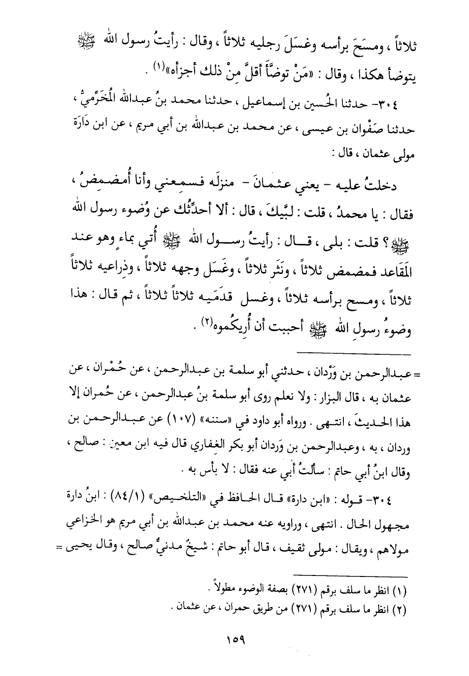 304 - حَدَّثَنَا الْحُسَيْنُ بْنُ إِسْمَاعِيلَ , نا مُحَمَّدُ بْنُ عَبْدِ اللَّهِ الْمُخَرِّمِيُّ , نا صَفْوَانُ بْنُ عِيسَى , عَنْ مُحَمَّدِ بْنِ عَبْدِ اللَّهِ بْنِ أَبِي مَرْيَمَ , عَنِ ابْنِ دَارَةَ مَوْلَى عُثْمَانَ , قَالَ: دَخَلْتُ عَلَيْهِ يَعْنِي عَلَى عُثْمَانَ مَنْزِلَهُ فَسَمِعَنِي وَأَنَا أَتَمَضْمَضُ , فَقَالَ: «يَا مُحَمَّدُ» , قُلْتُ: لَبَّيْكَ , قَالَ: «أَلَا أُحَدِّثُكَ عَنْ رَسُولِ اللَّهِ صَلَّى اللهُ عَلَيْهِ وَسَلَّمَ؟» , قُلْتُ: بَلَى , قَالَ: «رَأَيْتُ رَسُولَ اللَّهِ صَلَّى اللهُ عَلَيْهِ وَسَلَّمَ أُتِيَ بِمَاءٍ وَهُوَ عِنْدَ الْمَقَاعِدِ §فَمَضْمَضَ ثَلَاثًا , وَنَثَرَ ثَلَاثًا , وَغَسَلَ وَجْهَهُ ثَلَاثًا , وَذِرَاعَيْهِ ثَلَاثًا ثَلَاثًا , وَمَسَحَ بِرَأْسِهِ ثَلَاثًا , وَغَسَلَ قَدَمَيْهِ ثَلَاثًا ثَلَاثًا» , ثُمَّ قَالَ: «هَكَذَا وُضُوءُ رَسُولِ اللَّهِ صَلَّى اللهُ عَلَيْهِ وَسَلَّمَ أَحْبَبْتُ أَنْ أُرِيَكُمُوهُ»