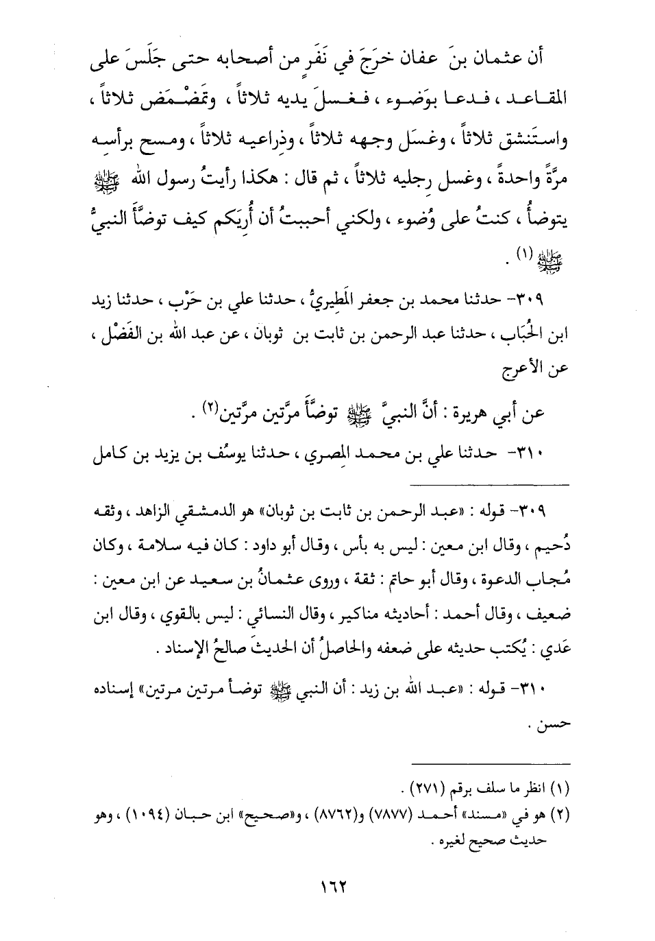 309 - حَدَّثَنَا مُحَمَّدُ بْنُ جَعْفَرٍ الْمَطِيرِيُّ , ثنا عَلِيُّ بْنُ حَرْبٍ , نا زَيْدُ بْنُ الْحُبَابِ , نا عَبْدُ الرَّحْمَنِ بْنُ ثَابِتِ بْنِ ثَوْبَانَ , عَنْ عَبْدِ اللَّهِ بْنِ الْفَضْلِ , عَنِ الْأَعْرَجِ , عَنْ أَبِي هُرَيْرَةَ , أَنَّ النَّبِيَّ صَلَّى اللهُ عَلَيْهِ وَسَلَّمَ § «تَوَضَّأَ مَرَّتَيْنِ مَرَّتَيْنِ»
