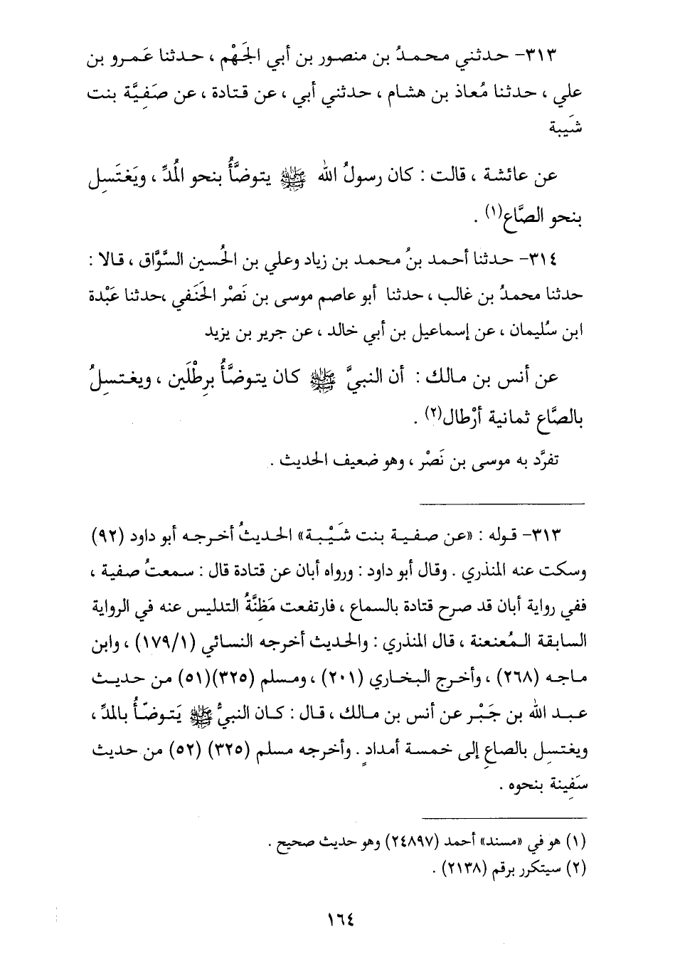 313 - حَدَّثَنِي مُحَمَّدُ بْنُ مَنْصُورِ بْنِ أَبِي الْجَهْمِ , ثنا عَمْرُو بْنُ عَلِيٍّ , نا مُعَاذُ بْنُ هِشَامٍ , حَدَّثَنِي أَبِي , عَنْ قَتَادَةَ , عَنْ صَفِيَّةَ بِنْتِ شَيْبَةَ , عَنْ عَائِشَةَ قَالَتْ: «كَانَ رَسُولُ اللَّهِ صَلَّى اللهُ عَلَيْهِ وَسَلَّمَ §يَتَوَضَّأُ بِنَحْوِ الْمُدِّ , وَيَغْتَسِلُ بِنَحْوِ الصَّاعِ»
