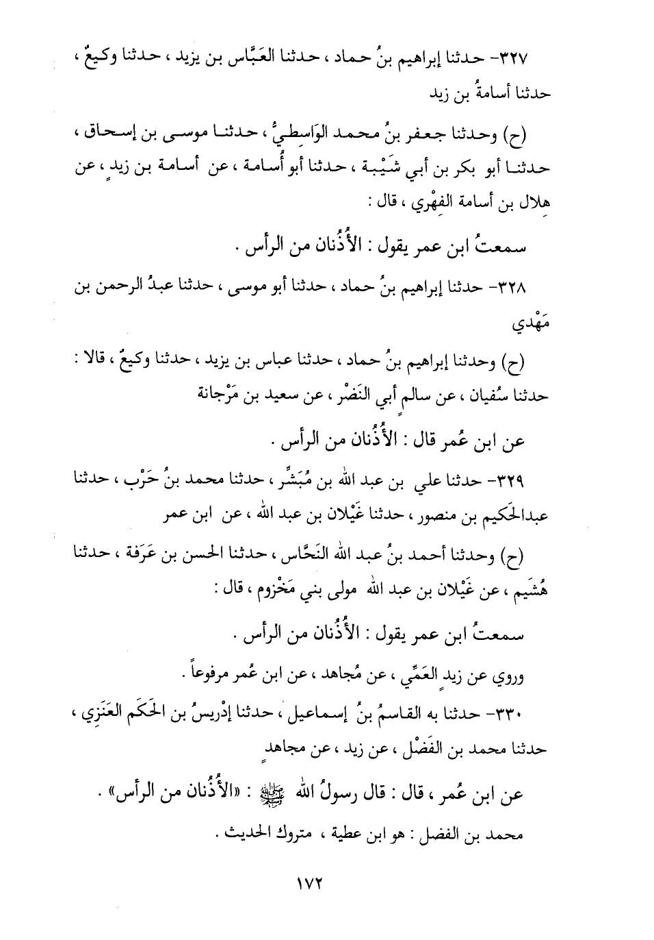 327 - حَدَّثَنَا إِبْرَاهِيمُ بْنُ حَمَّادٍ , نا الْعَبَّاسُ بْنُ يَزِيدَ , نا وَكِيعٌ , نا أُسَامَةُ بْنُ زَيْدٍ , وَثنا جَعْفَرُ بْنُ مُحَمَّدٍ الْوَاسِطِيُّ , نا مُوسَى بْنُ إِسْحَاقَ , نا أَبُو بَكْرِ بْنُ أَبِي شَيْبَةَ , نا أَبُو أُسَامَةَ , عَنْ أُسَامَةَ بْنِ زَيْدٍ , عَنْ هِلَالِ بْنِ أُسَامَةَ الْفِهْرِيِّ , قَالَ: سَمِعْتُ ابْنَ عُمَرَ , يَقُولُ: § «الْأُذُنَانِ مِنَ الرَّأْسِ»