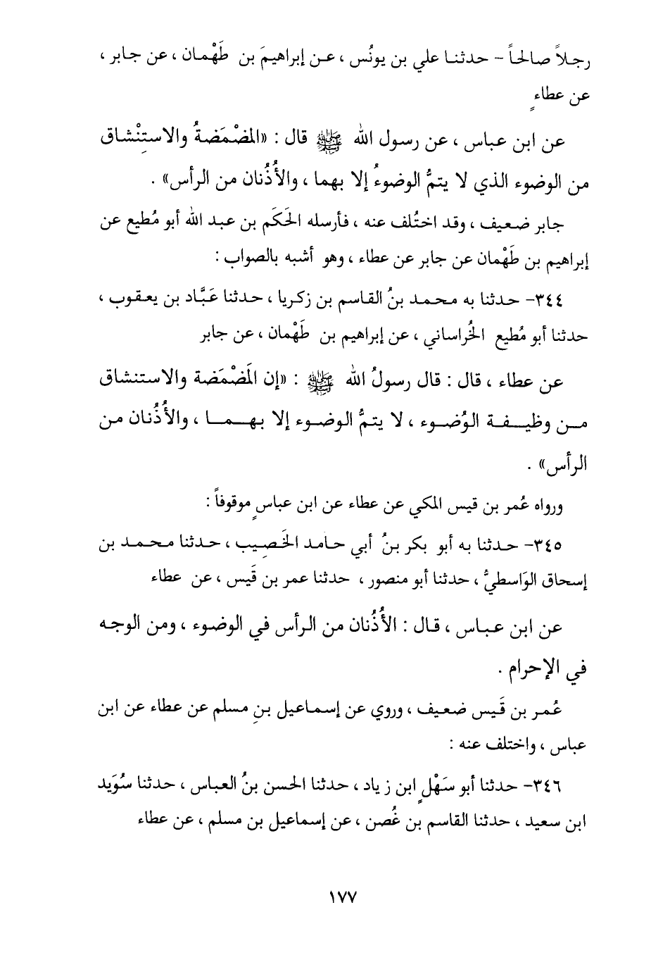 344 - حَدَّثَنَا بِهِ مُحَمَّدُ بْنُ الْقَاسِمِ بْنِ زَكَرِيَّا , ثنا عَبَّادُ بْنُ يَعْقُوبَ , نا أَبُو مُطِيعٍ الْخُرَاسَانِيُّ , عَنْ إِبْرَاهِيمَ بْنِ طَهْمَانَ , عَنْ جَابِرٍ , عَنْ عَطَاءٍ , قَالَ: قَالَ رَسُولُ اللَّهِ صَلَّى اللهُ عَلَيْهِ وَسَلَّمَ: «إِنَّ §الْمَضْمَضَةَ وَالِاسْتِنْشَاقَ مِنْ وَظِيفَةِ الْوُضُوءِ لَا يَتِمُّ الْوُضُوءُ إِلَّا بِهِمَا وَالْأُذُنَانِ مِنَ الرَّأْسِ». وَرَوَاهُ عُمَرُ بْنُ قَيْسٍ الْمَكِّيُّ , عَنْ عَطَاءٍ , عَنِ ابْنِ عَبَّاسِ مَوْقُوفًا