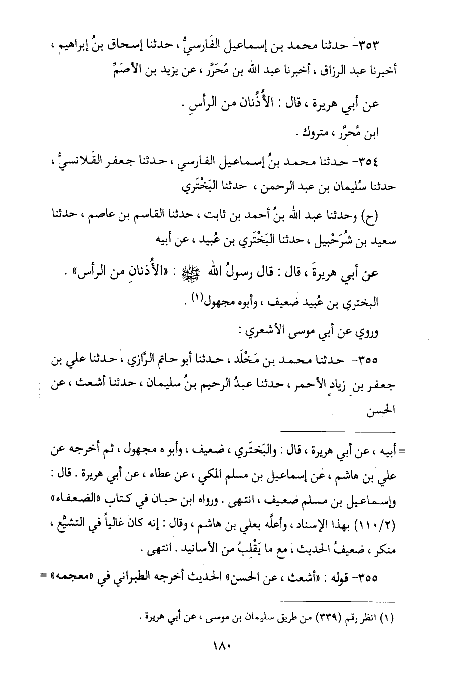 353 - نا مُحَمَّدُ بْنُ إِسْمَاعِيلَ الْفَارِسِيُّ , نا إِسْحَاقُ بْنُ إِبْرَاهِيمَ , نا عَبْدُ الرَّزَّاقِ , أنا عَبْدُ اللَّهِ بْنُ مُحَرَّرٍ , عَنْ يَزِيدَ بْنِ الْأَصَمِّ , عَنْ أَبِي هُرَيْرَةَ , قَالَ: § «الْأُذُنَانِ مِنَ الرَّأْسِ». ابْنُ مُحَرَّرٍ مَتْرُوكٌ