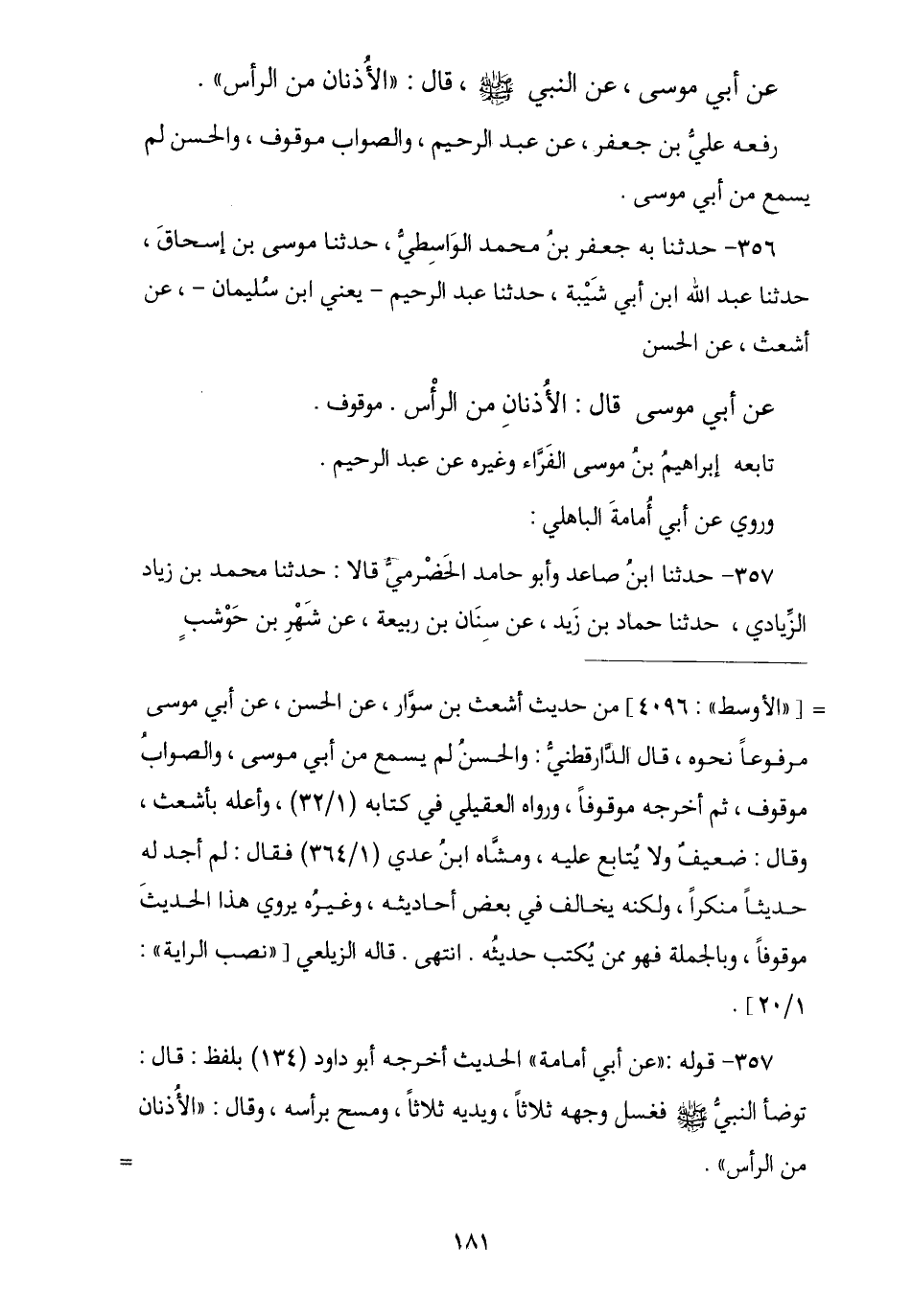 356 - حَدَّثَنَا جَعْفَرُ بْنُ مُحَمَّدٍ الْوَاسِطِيُّ , نا مُوسَى بْنُ إِسْحَاقَ , نا عَبْدُ اللَّهِ بْنُ أَبِي شَيْبَةَ , نا عَبْدُ الرَّحِيمِ يَعْنِي ابْنَ سُلَيْمَانَ , عَنْ أَشْعَثَ , عَنِ الْحَسَنِ , عَنْ أَبِي مُوسَى , قَالَ: § «الْأُذُنَانِ مِنَ الرَّأْسِ». مَوْقُوفٌ. تَابَعَهُ إِبْرَاهِيمُ بْنُ مُوسَى الْفَرَّاءُ وَغَيْرُهُ , عَنْ عَبْدِ الرَّحِيمِ. وَرُوِيَ عَنْ أَبِي أُمَامَةَ الْبَاهِلِيِّ