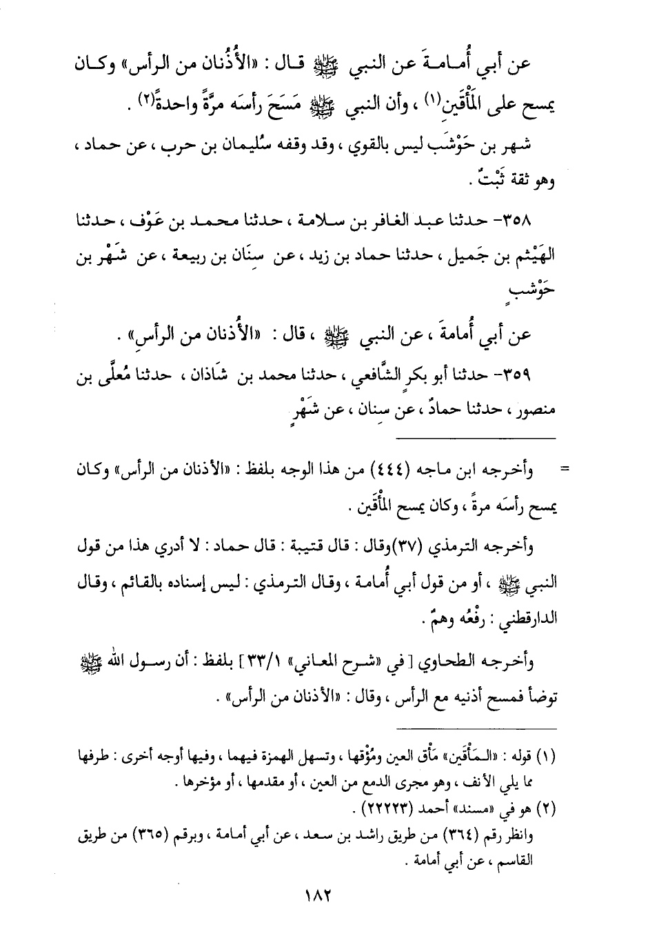 358 - حَدَّثَنَا عَبْدُ الْغَافِرِ بْنُ سَلَامَةَ , نا مُحَمَّدُ بْنُ عَوْفٍ , نا الْهَيْثَمُ بْنُ جَمِيلٍ , ثنا حَمَّادُ بْنُ زَيْدٍ , عَنْ سِنَانِ بْنِ رَبِيعَةَ , عَنْ شَهْرِ بْنِ حَوْشَبٍ , -[183]- عَنْ أَبِي أُمَامَةَ , عَنِ النَّبِيِّ صَلَّى اللهُ عَلَيْهِ وَسَلَّمَ قَالَ: § «الْأُذُنَانِ مِنَ الرَّأْسِ»