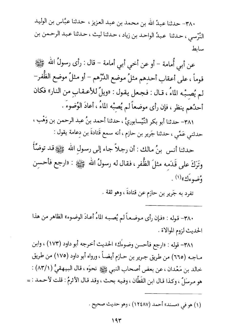 381 - حَدَّثَنَا أَبُو بَكْرٍ النَّيْسَابُورِيُّ , نا أَحْمَدُ بْنُ عَبْدِ الرَّحْمَنِ بْنِ وَهْبٍ , نا عَمِّي , نا جَرِيرُ بْنُ حَازِمٍ , أَنَّهُ سَمِعَ قَتَادَةَ بْنَ دِعَامَةَ , يَقُولُ: نا أَنَسُ بْنُ مَالِكٍ , أَنَّ رَجُلًا جَاءَ إِلَى رَسُولِ اللَّهِ صَلَّى اللهُ عَلَيْهِ وَسَلَّمَ قَدْ تَوَضَّأَ وَتَرَكَ عَلَى قَدَمَيْهِ مِثْلَ الظُّفُرِ , فَقَالَ لَهُ رَسُولُ اللَّهِ صَلَّى اللهُ عَلَيْهِ وَسَلَّمَ: § «ارْجِعْ فَأَحْسِنْ وُضُوءَكَ». تَفَرَّدَ بِهِ جَرِيرُ بْنُ حَازِمٍ , عَنْ قَتَادَةَ وَهُوَ ثِقَةٌ
