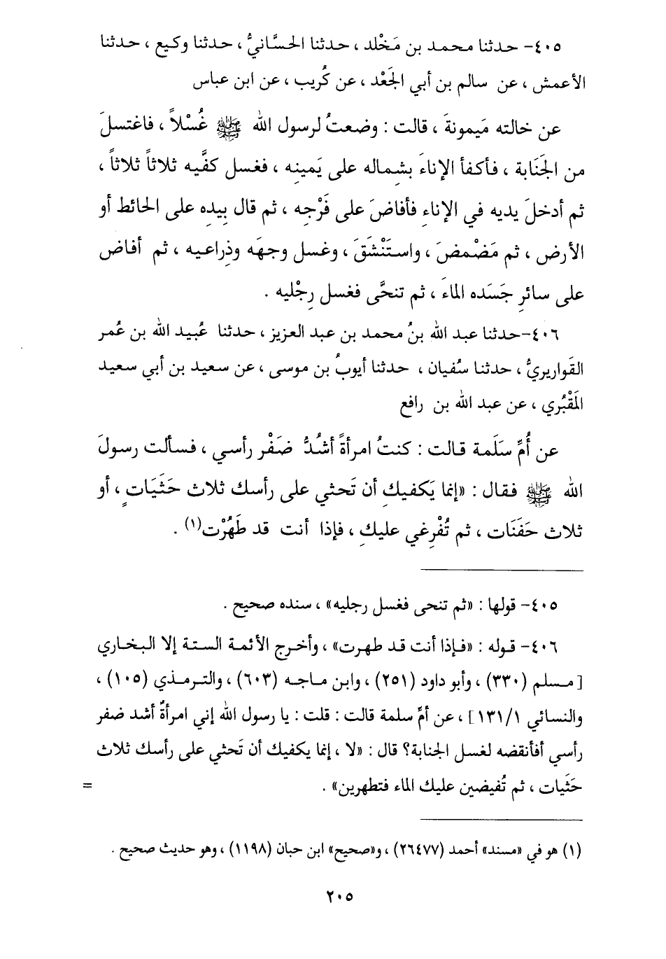 406 - حَدَّثَنَا عَبْدُ اللَّهِ بْنُ مُحَمَّدِ بْنِ عَبْدِ الْعَزِيزِ , ثنا عُبَيْدُ اللَّهِ بْنُ عُمَرَ الْقَوَارِيرِيُّ , ثنا سُفْيَانُ , نا أَيُّوبُ بْنُ مُوسَى , عَنْ سَعِيدِ بْنِ أَبِي سَعِيدٍ الْمَقْبُرِيِّ , عَنْ عَبْدِ اللَّهِ بْنِ رَافِعٍ , عَنْ أُمِّ سَلَمَةَ , قَالَتْ: كُنْتُ امْرَأَةً أَشُدُّ ضَفْرَ رَأْسِي فَسَأَلْتُ رَسُولَ اللَّهِ صَلَّى اللهُ عَلَيْهِ وَسَلَّمَ فَقَالَ: «إِنَّمَا §يَكْفِيكِ أَنْ تَحْثِيَ عَلَى رَأْسِكِ ثَلَاثَ حَثَيَاتٍ , أَوْ ثَلَاثَ حَفَنَاتٍ ثُمَّ تُفْرِغِي عَلَيْكِ فَإِذَا أَنْتِ قَدْ طَهُرْتِ»