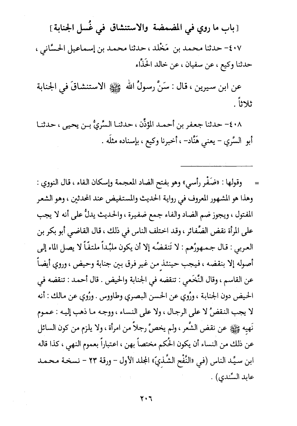 407 - حَدَّثَنَا مُحَمَّدُ بْنُ مَخْلَدٍ , نا مُحَمَّدُ بْنُ إِسْمَاعِيلَ الْحَسَّانِيُّ , نا وَكِيعٌ , عَنْ سُفْيَانَ , عَنْ خَالِدٍ الْحَذَّاءِ , عَنِ ابْنِ سِيرِينَ , قَالَ: سَنَّ رَسُولُ اللَّهِ صَلَّى اللهُ عَلَيْهِ وَسَلَّمَ: § «الِاسْتِنْشَاقَ فِي الْجَنَابَةِ ثَلَاثًا».