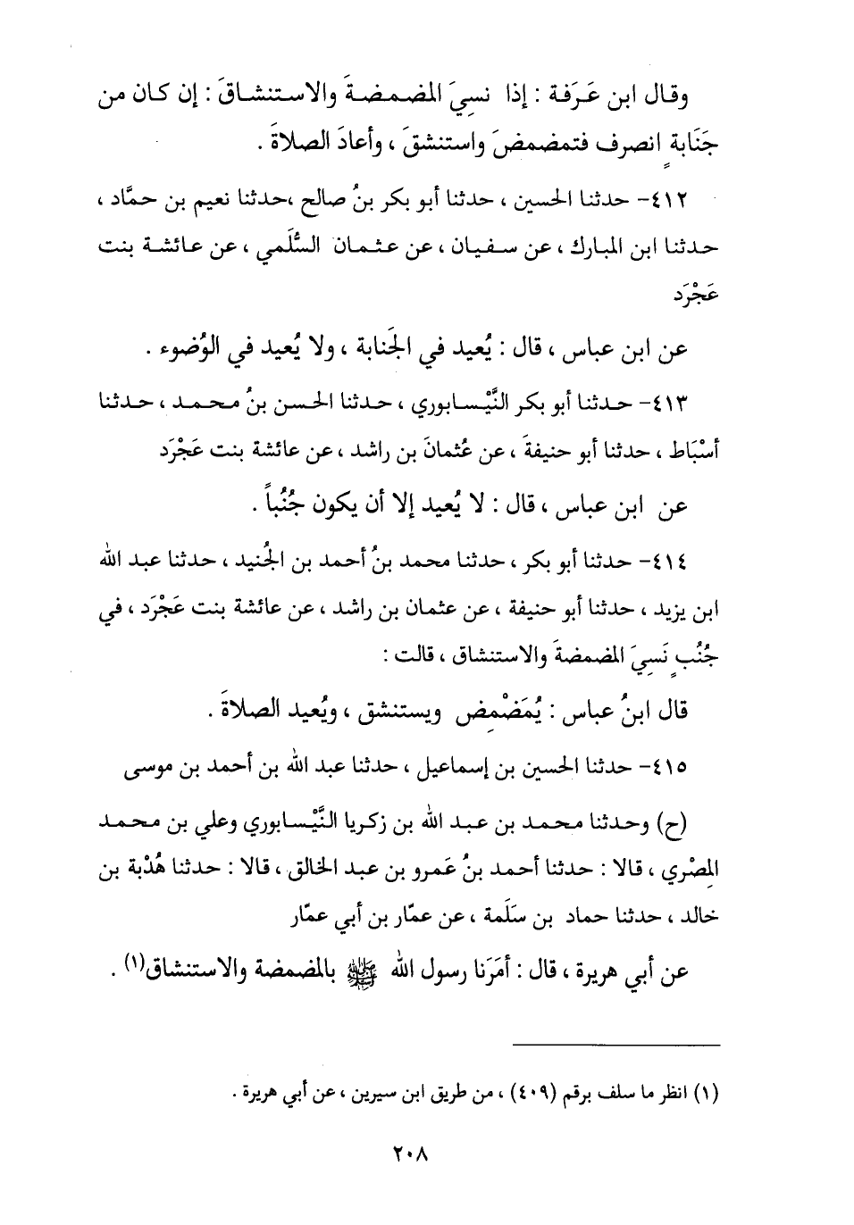 412 - حَدَّثَنَا الْحُسَيْنُ , نا أَبُو بَكْرِ بْنُ صَالِحٍ , نا نُعَيْمُ بْنُ حَمَّادٍ , نا ابْنُ الْمُبَارَكِ , عَنْ سُفْيَانَ , عَنْ عُثْمَانَ بْنِ رَاشِدٍ , عَنْ عَائِشَةَ بِنْتِ عَجْرَدٍ , عَنِ ابْنِ عَبَّاسٍ , قَالَ: § «يُعِيدُ فِي الْجَنَابَةِ وَلَا يُعِيدُ فِي الْوُضُوءِ»
