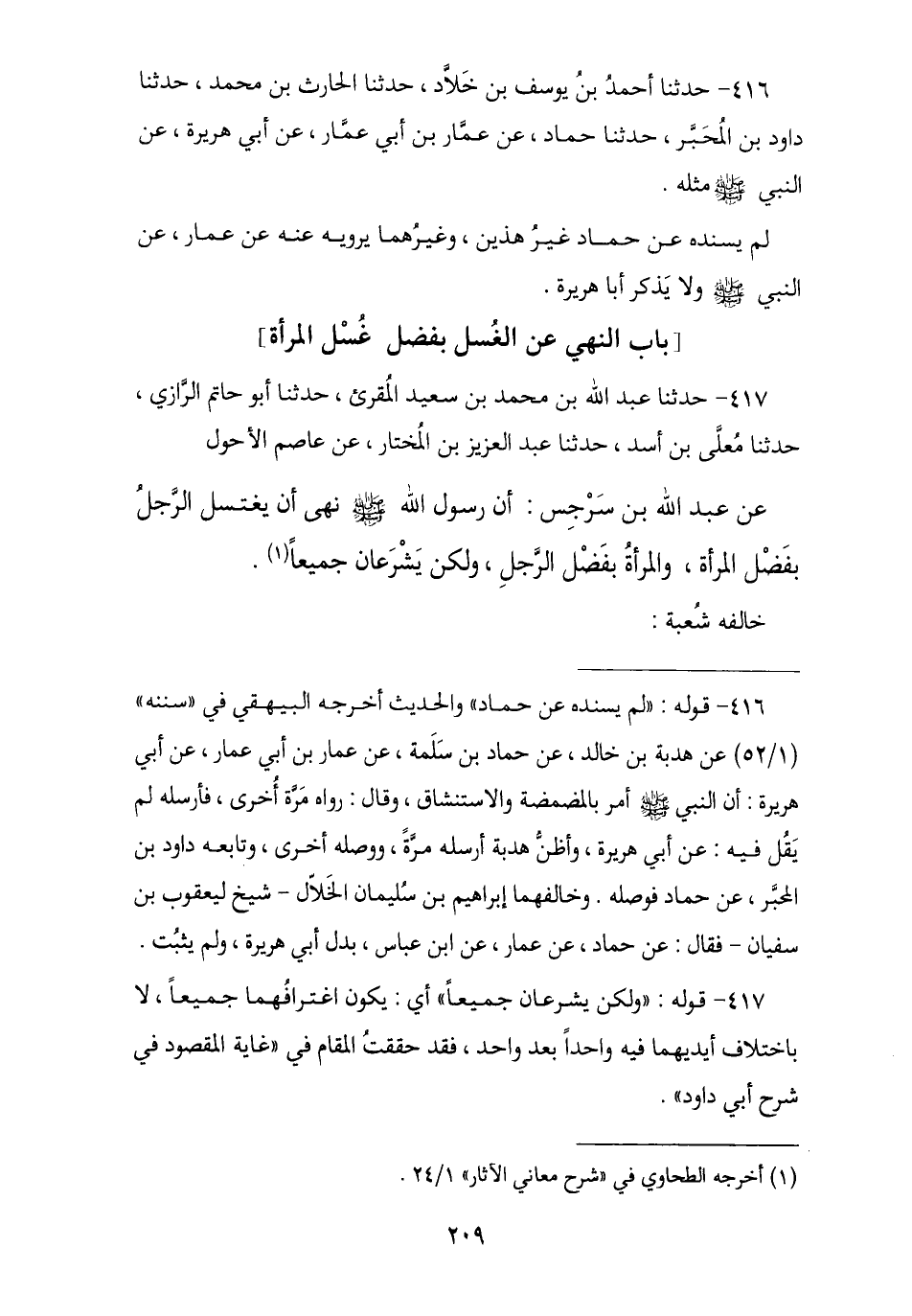 417 - حَدَّثَنَا عَبْدُ اللَّهِ بْنُ مُحَمَّدِ بْنِ سَعِيدٍ الْمَقْبُرِيُّ , ثنا أَبُو حَاتِمٍ الرَّازِيُّ , نا مُعَلَّى بْنُ أَسَدٍ , نا عَبْدُ الْعَزِيزِ بْنُ الْمُخْتَارِ , عَنْ عَاصِمٍ الْأَحْوَلِ , عَنْ عَبْدِ اللَّهِ بْنِ سَرْجِسَ , أَنَّ رَسُولَ اللَّهِ صَلَّى اللهُ عَلَيْهِ وَسَلَّمَ § «نَهَى أَنْ يَغْتَسِلَ الرَّجُلُ بِفَضْلِ الْمَرْأَةِ , وَالْمَرْأَةُ بِفَضْلِ الرَّجُلِ , وَلَكِنْ يَشْرَعَانِ جَمِيعًا». خَالَفَهُ شُعْبَةُ