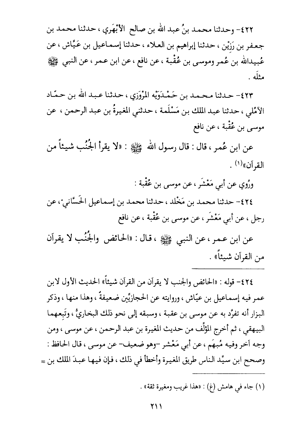 423 - حَدَّثَنَا مُحَمَّدُ بْنُ حَمْدَوَيْهِ الْمَرْوَزِيُّ , نا عَبْدُ اللَّهِ بْنُ حَمَّادٍ الْآمُلِيُّ , ثنا عَبْدُ الْمَلِكِ بْنُ مَسْلَمَةَ , حَدَّثَنِي الْمُغِيرَةُ بْنُ عَبْدِ الرَّحْمَنِ , عَنْ مُوسَى بْنِ عُقْبَةَ , عَنْ نَافِعٍ , عَنِ ابْنِ عُمَرَ , قَالَ: قَالَ رَسُولُ اللَّهِ صَلَّى اللهُ عَلَيْهِ وَسَلَّمَ: § «لَا يَقْرَأُ الْجُنُبُ شَيْئًا مِنَ الْقُرْآنِ». عَبْدُ الْمَلِكِ هَذَا كَانَ بِمِصْرَ وَهَذَا غَرِيبٌ , عَنْ مُغِيرَةَ بْنِ عَبْدِ الرَّحْمَنِ وَهُوَ ثِقَةٌ , وَرَوَى عَنْ أَبِي مَعْشَرٍ , عَنْ مُوسَى بْنِ عُقْبَةَ