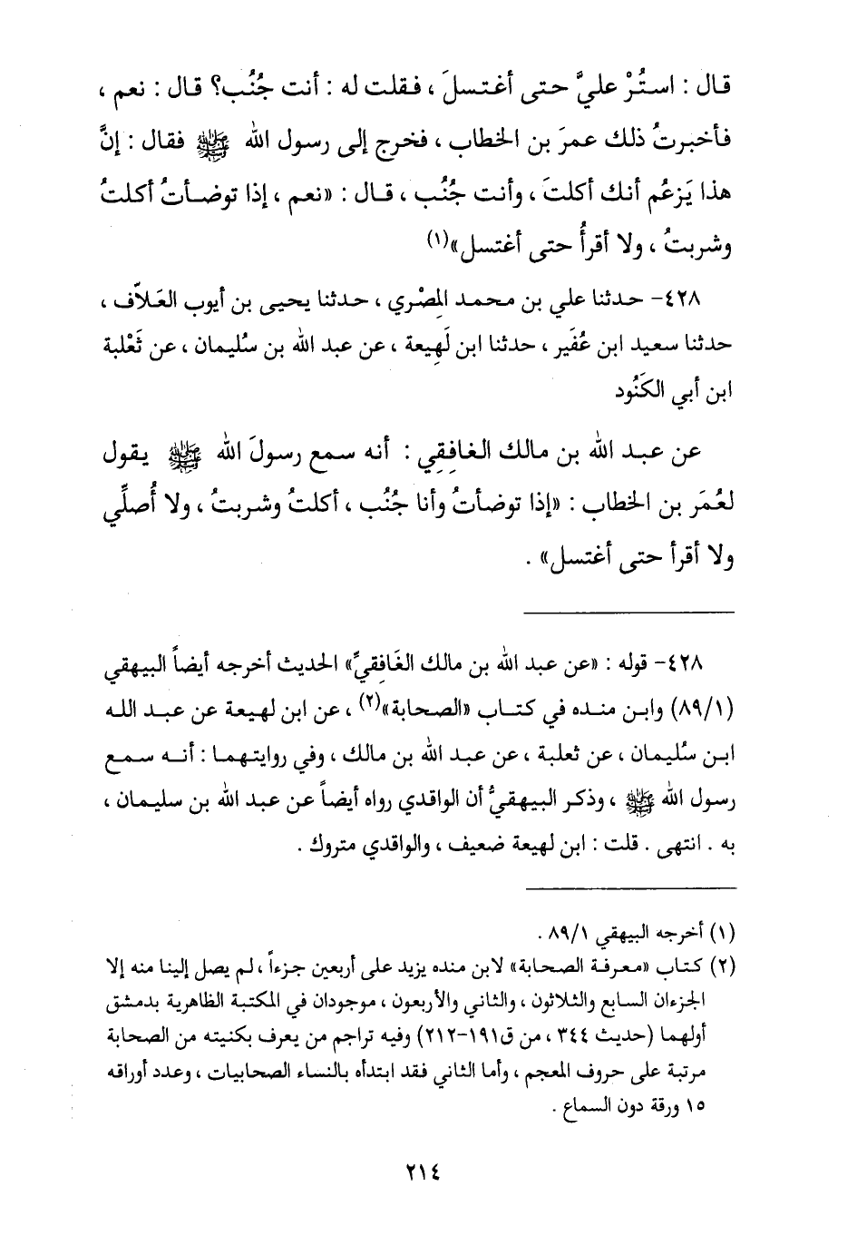 428 - حَدَّثَنَا عَلِيُّ بْنُ مُحَمَّدٍ الْمِصْرِيُّ , نا يَحْيَى بْنُ أَيُّوبَ الْعَلَّافُ , نا سَعِيدُ بْنُ عُفَيْرٍ , نا ابْنُ لَهِيعَةَ , عَنْ عَبْدِ اللَّهِ بْنِ سُلَيْمَانَ , عَنْ ثَعْلَبَةَ بْنِ أَبِي الْكَنُودِ , عَنْ عَبْدِ اللَّهِ بْنِ مَالِكٍ الْغَافِقِيِّ , أَنَّهُ سَمِعَ رَسُولَ اللَّهِ صَلَّى اللهُ عَلَيْهِ وَسَلَّمَ يَقُولُ لِعُمَرَ بْنَ الْخَطَّابِ: § «إِذَا تَوَضَّأْتُ وَأَنَا جُنُبٌ أَكَلْتُ وَشَرِبْتُ وَلَا أُصَلِّي وَلَا أَقْرَأُ حَتَّى أَغْتَسِلَ»