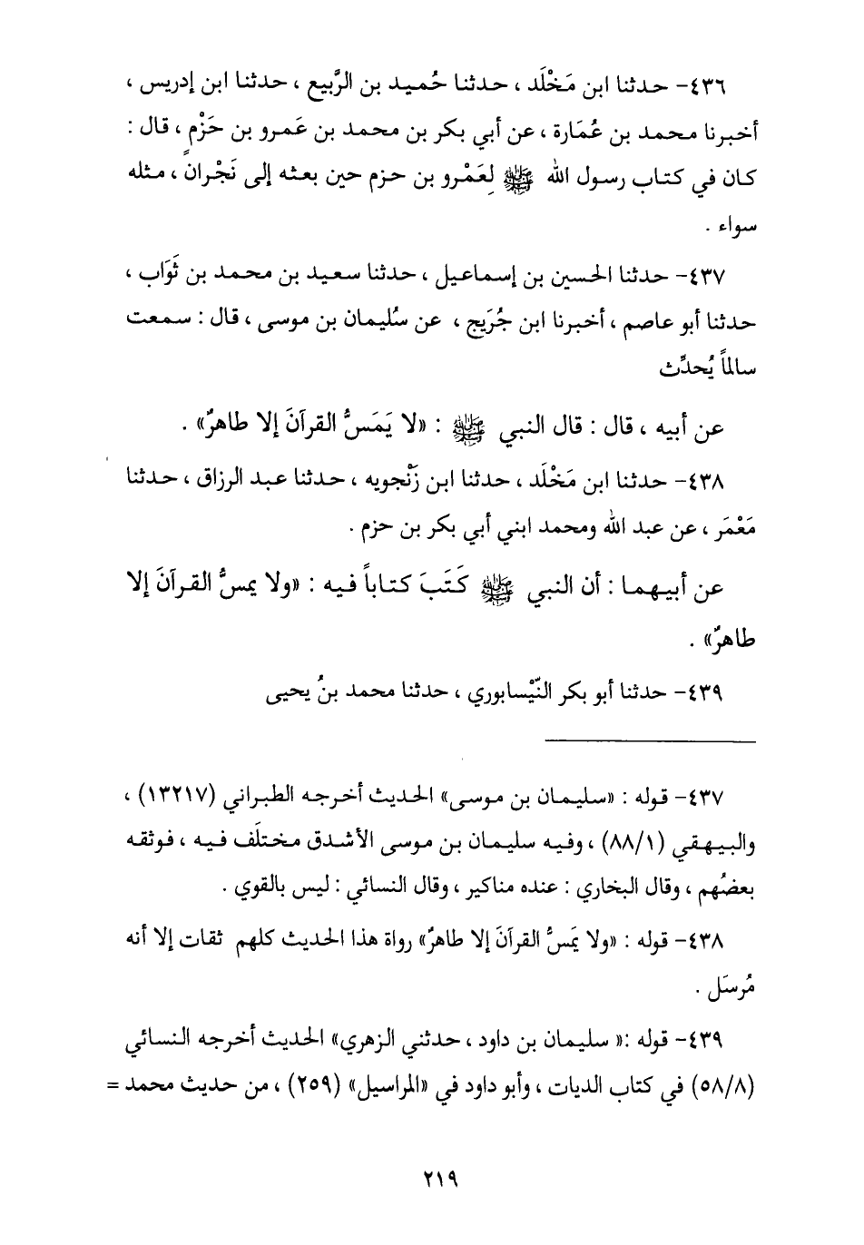 439 - حَدَّثَنَا أَبُو بَكْرٍ النَّيْسَابُورِيُّ , نا مُحَمَّدُ بْنُ يَحْيَى , -[220]- ح وَثنا الْحُسَيْنُ بْنُ إِسْمَاعِيلَ , نا إِبْرَاهِيمُ بْنُ هَانِئٍ , قَالَا: نا الْحَكَمُ بْنُ مُوسَى , نا يَحْيَى بْنُ حَمْزَةَ , عَنْ سُلَيْمَانَ بْنِ دَاوُدَ , حَدَّثَنِي الزُّهْرِيُّ , عَنْ أَبِي بَكْرِ بْنِ مُحَمَّدِ بْنِ عَمْرِو بْنِ حَزْمٍ , عَنْ أَبِيهِ , عَنْ جَدِّهِ , أَنَّ رَسُولَ اللَّهِ صَلَّى اللهُ عَلَيْهِ وَسَلَّمَ كَتَبَ إِلَى أَهْلِ الْيَمَنِ كِتَابًا فَكَانَ فِيهِ: § «لَا يَمَسَّ الْقُرْآنَ إِلَّا طَاهِرٌ»