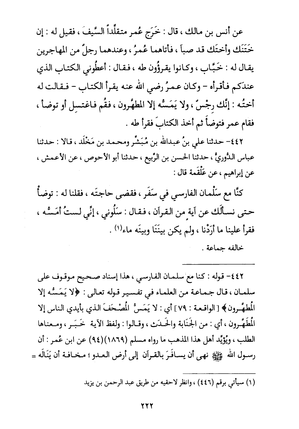 442 - حَدَّثَنَا عَلِيُّ بْنُ عَبْدِ اللَّهِ بْنِ مُبَشِّرٍ , وَمُحَمَّدُ بْنُ مَخْلَدٍ , قَالَا: نا الْعَبَّاسُ الدُّورِيُّ , نا الْحَسَنُ بْنُ الرَّبِيعِ , ثنا أَبُو الْأَحْوَصِ , عَنِ الْأَعْمَشِ , عَنْ إِبْرَاهِيمَ , عَنْ عَلْقَمَةَ , قَالَ: كُنَّا مَعَ سَلْمَانَ الْفَارِسِيِّ فِي سَفَرٍ فَقَضَى حَاجَتَهُ , فَقُلْنَا لَهُ: تَوَضَّأْ حَتَّى نَسْأَلَكَ عَنْ آيَةٍ مِنَ الْقُرْآنِ , فَقَالَ: § «سَلُونِي فَإِنِّي لَسْتُ أَمَسُّهُ فَقَرَأَ عَلَيْنَا مَا أَرَدْنَا وَلَمْ يَكُنْ بَيْنَنَا وَبَيْنَهُ مَاءٌ». كُلُّهُمْ ثِقَاتٌ خَالَفَهُ جَمَاعَةٌ