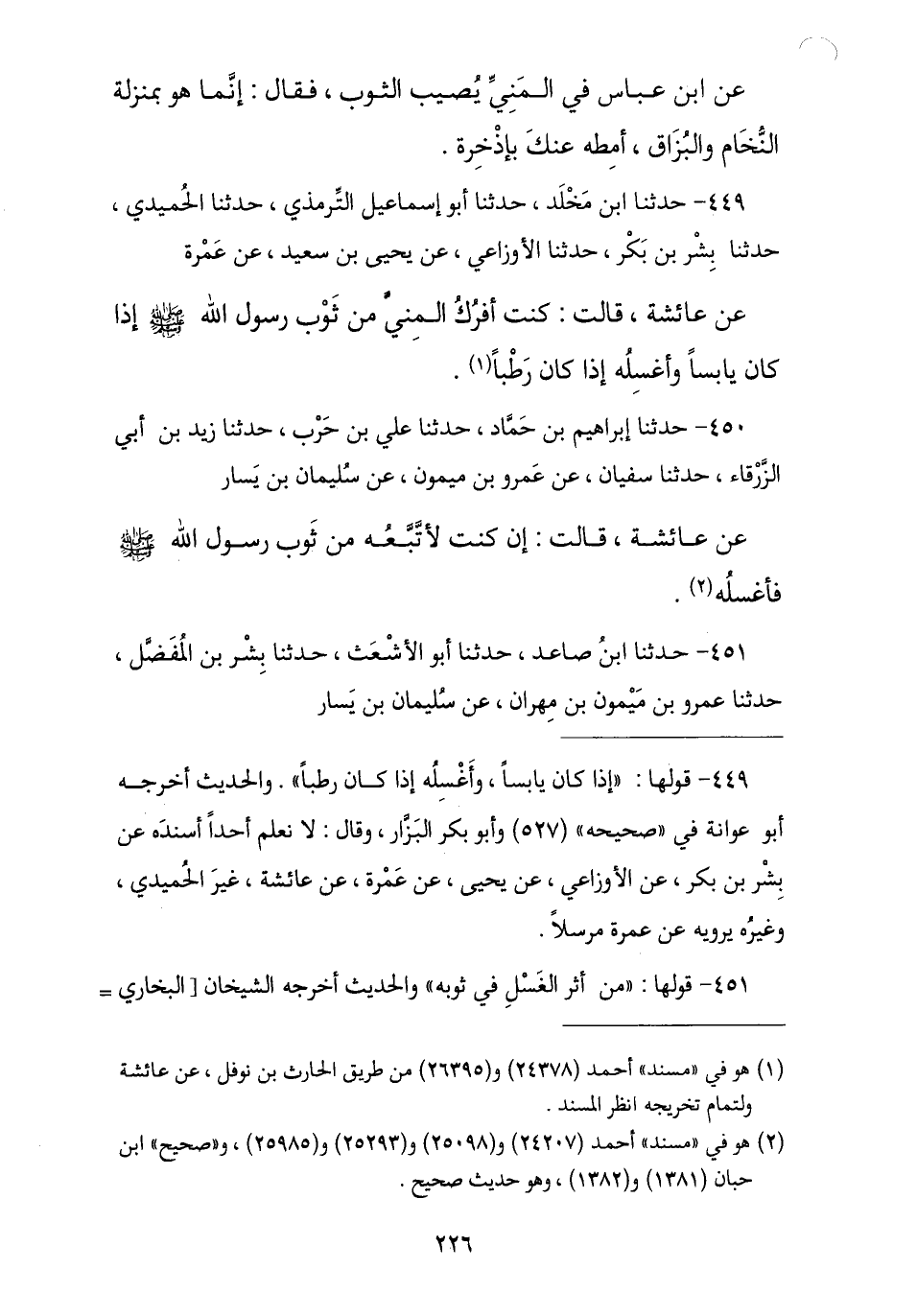 449 - حَدَّثَنَا مُحَمَّدُ بْنُ مَخْلَدٍ , نا أَبُو إِسْمَاعِيلَ التِّرْمِذِيُّ , ثنا الْحُمَيْدِيُّ , نا بِشْرُ بْنُ بَكْرٍ , نا الْأَوْزَاعِيُّ , عَنْ يَحْيَى بْنِ سَعِيدٍ , عَنْ عَمْرَةَ , عَنْ عَائِشَةَ , قَالَتْ: § «كُنْتُ أَفْرُكُ الْمَنِيَّ مِنْ ثَوْبِ رَسُولِ اللَّهِ صَلَّى اللهُ عَلَيْهِ وَسَلَّمَ إِذَا كَانَ يَابِسًا وَأَغْسِلُهُ إِذَا كَانَ رَطْبًا»