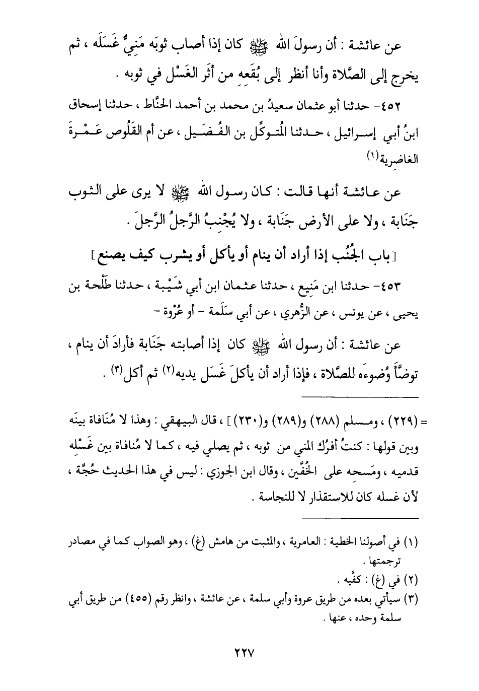 453 - حَدَّثَنَا ابْنُ مَنِيعٍ , نا عُثْمَانُ بْنُ أَبِي شَيْبَةَ , نا طَلْحَةُ بْنُ يَحْيَى , عَنْ يُونُسَ , عَنِ الزُّهْرِيِّ , عَنْ أَبِي سَلَمَةَ , أَوْ عُرْوَةَ , عَنْ عَائِشَةَ , أَنَّ رَسُولَ اللَّهِ صَلَّى اللهُ عَلَيْهِ وَسَلَّمَ «كَانَ §إِذَا أَصَابَتْهُ جَنَابَةٌ فَأَرَادَ أَنْ يَنَامَ تَوَضَّأَ وُضُوءَهُ لِلصَّلَاةِ , فَإِذَا أَرَادَ أَنْ يَأْكُلَ غَسَلَ كَفَّيْهِ ثُمَّ أَكَلَ». صَحِيحٌ