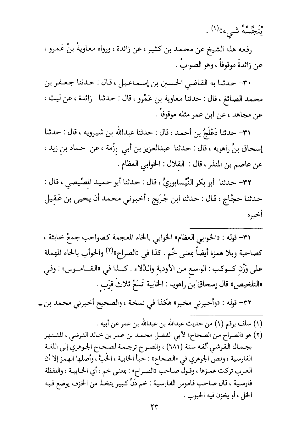 31 - نا دَعْلَجُ بْنُ أَحْمَدَ , نا عَبْدُ اللَّهِ بْنُ شِيرَوَيْهِ , نا إِسْحَاقُ بْنُ رَاهَوَيْهِ , نا عَبْدُ الْعَزِيزِ بْنُ أَبِي رِزْمَةَ , عَنْ حَمَّادِ بْنِ زَيْدٍ , عَنْ عَاصِمِ بْنِ الْمُنْذِرِ , قَالَ: § «الْقِلَالُ الْخَوَابِي الْعِظَامُ»