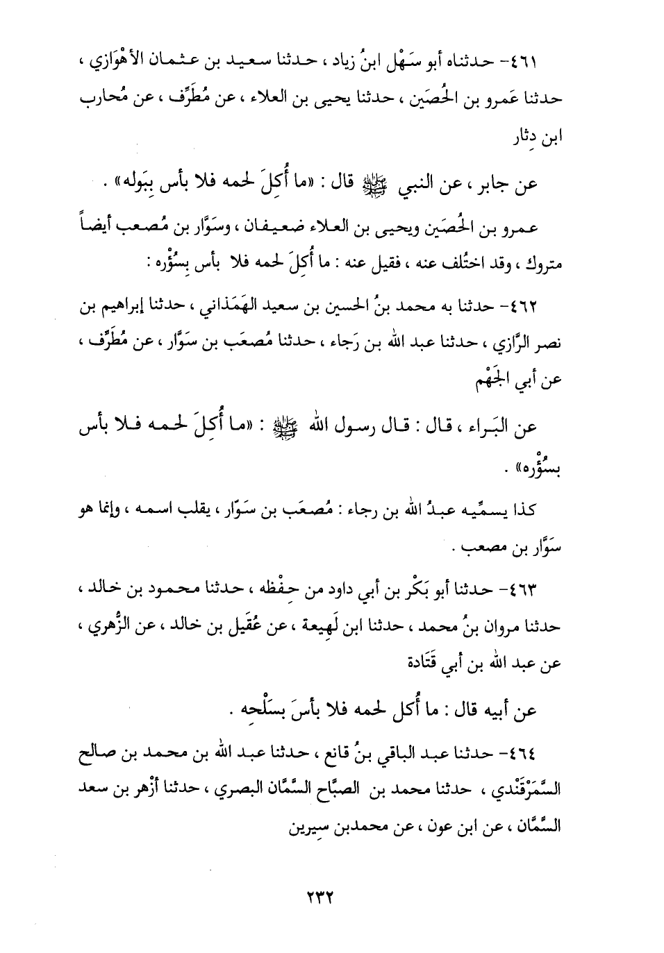 462 - حَدَّثَنَا بِهِ مُحَمَّدُ بْنُ الْحُسَيْنِ بْنِ سَعِيدٍ الْهَمْدَانِيُّ , نا إِبْرَاهِيمُ بْنُ نَصْرٍ الرَّازِيُّ , نا عَبْدُ اللَّهِ بْنُ رَجَاءٍ , نا مُصْعَبُ بْنُ سَوَّارٍ , عَنْ مُطَرِّفٍ , عَنْ أَبِي الْجَهْمِ , عَنِ الْبَرَاءِ , قَالَ: قَالَ رَسُولُ اللَّهِ صَلَّى اللهُ عَلَيْهِ وَسَلَّمَ: § «مَا أُكِلَ لَحْمُهُ فَلَا بَأْسَ بِسُؤْرِهِ». كَذَا يُسَمِّيهِ عَبْدُ اللَّهِ بْنُ رَجَاءٍ: مُصْعَبُ بْنُ سَوَّارٍ فَقَلَبَ اسْمَهُ وَإِنَّمَا هُوَ: سَوَّارُ بْنُ مُصْعَبٍ