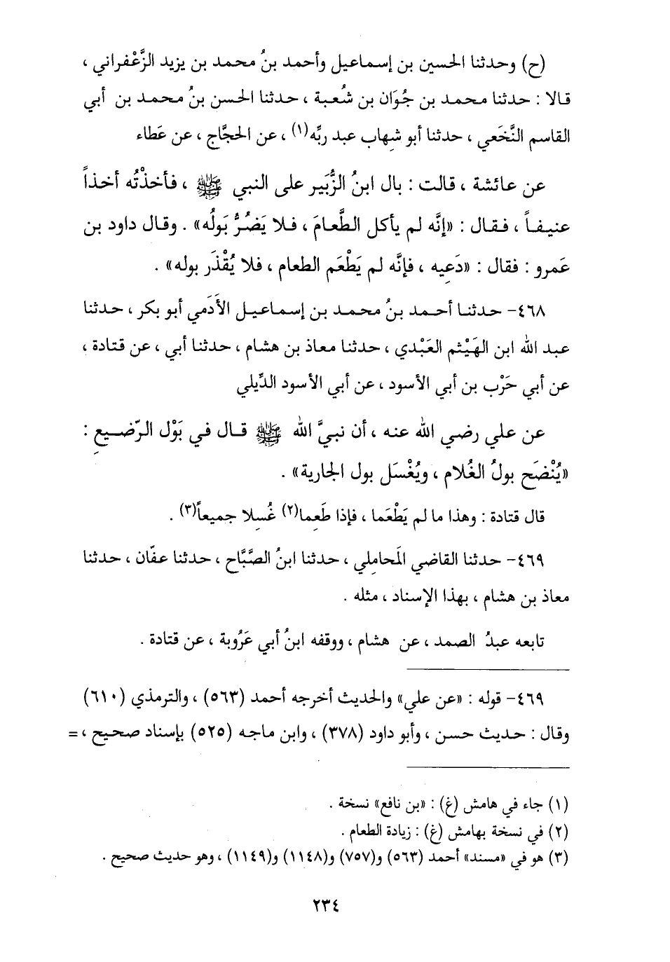 468 - نا أَحْمَدُ بْنُ مُحَمَّدِ بْنِ إِسْمَاعِيلَ الْآدَمَيُّ أَبُو بَكْرٍ , نا عَبْدُ اللَّهِ بْنُ الْهَيْثَمِ الْعَبْدِيُّ , نا مُعَاذُ بْنُ هِشَامٍ , حَدَّثَنَا أَبِي , عَنْ قَتَادَةَ , عَنْ أَبِي حَرْبِ بْنِ أَبِي الْأَسْوَدِ , عَنْ أَبِي الْأَسْوَدِ الدِّيلِيِّ , عَنْ عَلِيٍّ رَضِيَ اللَّهُ عَنْهُ , أَنَّ نَبِيَّ اللَّهِ صَلَّى اللهُ عَلَيْهِ وَسَلَّمَ قَالَ فِي بَوْلِ الرَّضِيعِ: § «يُنْضَحُ بَوْلُ الْغُلَامِ , وَيُغْسَلُ بَوْلُ الْجَارِيَةِ». قَالَ قَتَادَةُ: وَهَذَا مَا لَمْ يَطْعَمَا فَإِذَا طَعِمَا الطَّعَامَ غُسِلَا جَمِيعًا.