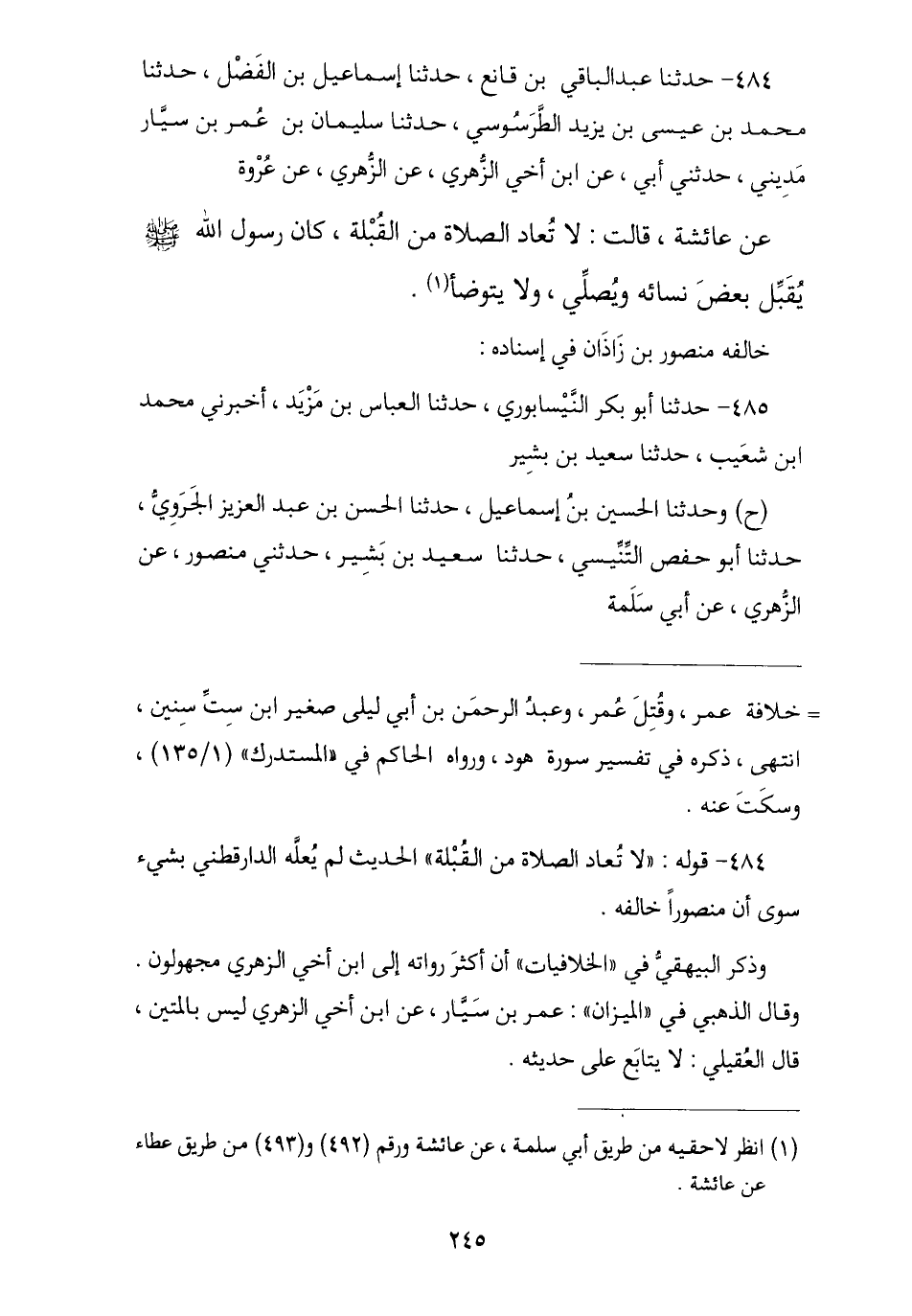 484 - حَدَّثَنَا عَبْدُ الْبَاقِي بْنُ قَانِعٍ , نا إِسْمَاعِيلُ بْنُ الْفَضْلِ , نا مُحَمَّدُ بْنُ عِيسَى بْنِ يَزِيدَ الطَّرَسُوسِيُّ , نا سُلَيْمَانُ بْنُ عُمَرَ بْنِ سَيّْارٍ مَدِينِيُّ , حَدَّثَنِي أَبِي , عَنِ ابْنِ أَخِي الزُّهْرِيِّ , عَنْ عُرْوَةَ , عَنْ عَائِشَةَ , قَالَتْ: «§لَا تُعَادُ الصَّلَاةُ مِنَ الْقُبْلَةِ كَانَ رَسُولُ اللَّهِ صَلَّى اللهُ عَلَيْهِ وَسَلَّمَ يُقَبِّلُ بَعْضَ نِسَائِهِ وَيُصَلِّي وَلَا يَتَوَضَّأُ». خَالَفَهُ مَنْصُورُ بْنُ زَاذَانَ فِي إِسْنَادِهِ