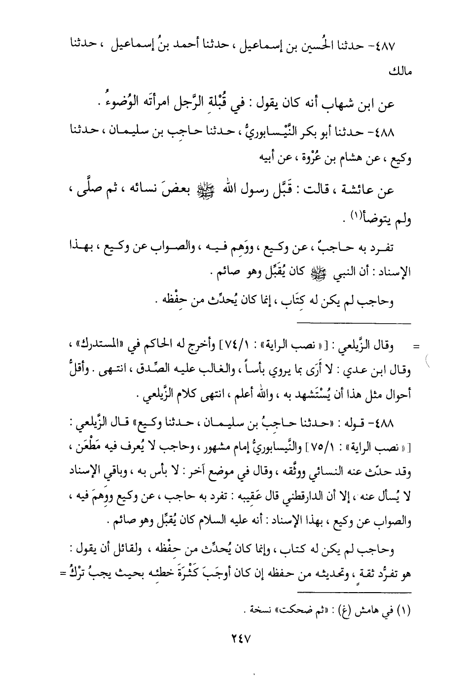 488 - حَدَّثَنَا أَبُو بَكْرٍ النَّيْسَابُورِيُّ , نا حَاجِبُ بْنُ سُلَيْمَانَ , نا وَكِيعٌ , عَنْ هِشَامِ بْنِ عُرْوَةَ , عَنْ أَبِيهِ , عَنْ عَائِشَةَ , قَالَتْ: § «قَبَّلَ رَسُولُ اللَّهِ صَلَّى اللهُ عَلَيْهِ وَسَلَّمَ بَعْضَ نِسَائِهِ ثُمَّ صَلَّى وَلَمْ يَتَوَضَّأْ ثُمَّ ضَحِكَتْ». تَفَرَّدَ بِهِ حَاجِبٌ عَنْ وَكِيعٍ وَوَهِمَ فِيهِ وَالصَّوَابُ عَنْ وَكِيعٍ بِهَذَا الْإِسْنَادِ أَنَّ النَّبِيَّ صَلَّى اللهُ عَلَيْهِ وَسَلَّمَ كَانَ يُقَبِّلُ وَهُوَ صَائِمٌ , وَحَاجِبٌ لَمْ يَكُنْ لَهُ كِتَابٌ إِنَّمَا كَانَ يُحَدِّثُ مِنْ حِفْظِهِ