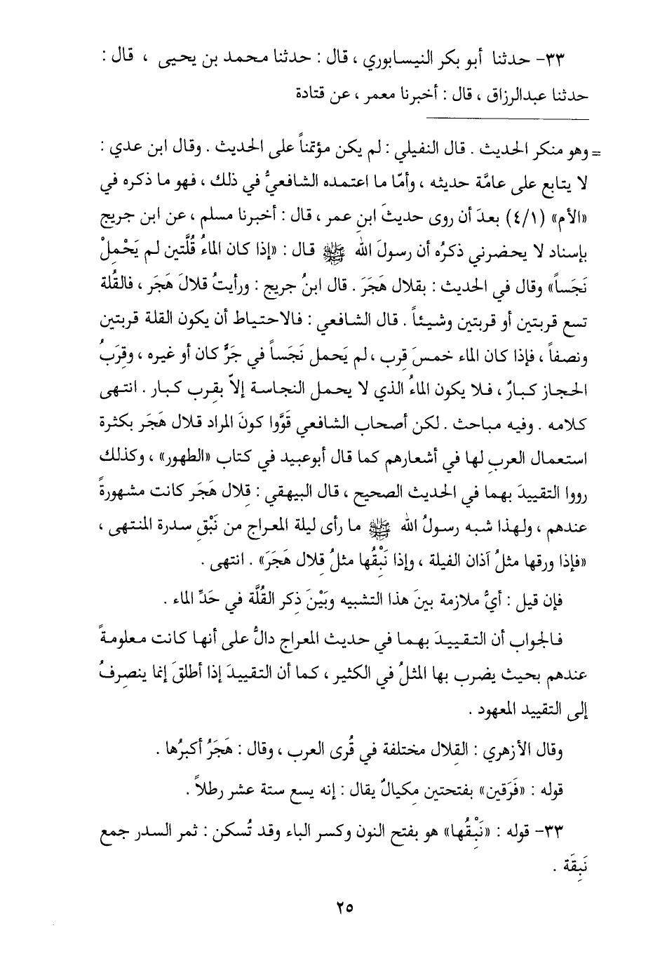 33 - حَدَّثَنَا أَبُو بَكْرٍ النَّيْسَابُورِيُّ , ثنا مُحَمَّدُ بْنُ يَحْيَى , نا عَبْدُ الرَّزَّاقِ , أنا مَعْمَرٌ , عَنْ قَتَادَةَ , -[26]- عَنْ أَنَسٍ , أَنَّ النَّبِيَّ صَلَّى اللهُ عَلَيْهِ وَسَلَّمَ قَالَ: §" لَمَّا رُفِعْتُ إِلَى سِدْرَةِ الْمُنْتَهَى فِي السَّمَاءِ السَّابِعَةِ نَبْقُهَا مِثْلُ قِلَالِ هَجَرَ , وَوَرَقُهَا مِثْلُ آذَانِ الْفِيَلَةِ , يَخْرُجُ مِنْ سَاقِهَا نَهْرَانِ ظَاهِرَانِ وَنَهْرَانِ بَاطِنَانِ قُلْتُ: يَا جِبْرِيلُ مَا هَذَا؟ قَالَ: أَمَّا الْبَاطِنَانِ فَفِي الْجَنَّةِ وَأَمَّا الظَّاهِرَانِ فَالنِّيلُ وَالْفُرَاتُ "