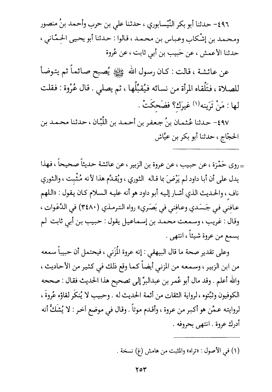 496 - حَدَّثَنَا أَبُو بَكْرٍ النَّيْسَابُورِيُّ , نا عَلِيُّ بْنُ حَرْبٍ , وَأَحْمَدُ بْنُ مَنْصُورٍ , وَمُحَمَّدُ بْنُ إِشْكَابَ , وَعَبَّاسُ بْنُ مُحَمَّدٍ , قَالُوا: نا أَبُو يَحْيَى الْحِمَّانِيُّ , نا الْأَعْمَشُ , عَنْ حَبِيبِ بْنِ أَبِي ثَابِتٍ , عَنْ عُرْوَةَ , عَنْ عَائِشَةَ , قَالَتْ: كَانَ رَسُولُ اللَّهِ صَلَّى اللهُ عَلَيْهِ وَسَلَّمَ § «يُصْبِحُ صَائِمًا ثُمَّ يَتَوَضَّأُ لِلصَّلَاةِ فَتَلَقَّاهُ الْمَرْأَةُ مِنْ نِسَائِهِ فَيُقَبِّلُهَا ثُمَّ يُصَلِّي». , قَالَ عُرْوَةُ: قُلْتُ لَهَا مَنْ تَرِينَهُ غَيْرُكِ؟ , فَضَحِكَتْ