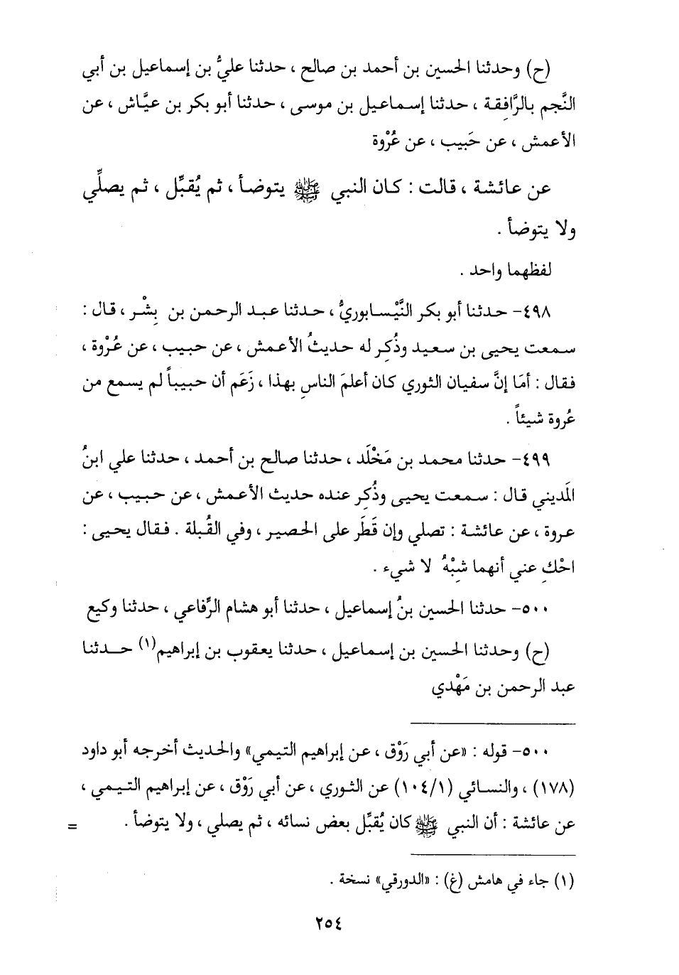 سُفْيَانُ الثَّوْرِيُّ , عَنْ أَبِي رَوْقٍ , عَنْ إِبْرَاهِيمَ التَّيْمِيِّ , عَنْ عَائِشَةَ , قَالَتْ: كَانَ رَسُولُ اللَّهِ صَلَّى اللهُ عَلَيْهِ وَسَلَّمَ § «يَتَوَضَّأُ ثُمَّ يُقَبِّلُ بَعْدَمَا يَتَوَضَّأُ ثُمَّ يُصَلِّي وَلَا يَتَوَضَّأُ» هَذَا حَدِيثُ غُنْدَرٍ , وَقَالَ وَكِيعٌ: إِنَّ النَّبِيَّ صَلَّى اللهُ عَلَيْهِ وَسَلَّمَ قَبَّلَ بَعْضَ نِسَائِهِ ثُمَّ صَلَّى وَلَمْ يَتَوَضَّأْ. وَقَالَ ابْنُ مَهْدِيٍّ: إِنَّ النَّبِيَّ صَلَّى اللهُ عَلَيْهِ وَسَلَّمَ قَبَّلَهَا وَلَمْ يَتَوَضَّأْ. وَقَالَ أَبُو عَاصِمٍ: كَانَ النَّبِيُّ صَلَّى اللهُ عَلَيْهِ وَسَلَّمَ يُقَبِّلُ ثُمَّ يُصَلِّي وَلَا يَتَوَضَّأُ , -[256]- لَمْ يَرْوِهِ عَنْ إِبْرَاهِيمَ التَّيْمِيِّ غَيْرُ أَبِي رَوْقٍ عَطِيَّةَ بْنِ الْحَارِثِ , وَلَا نَعْلَمُ حَدَّثَ بِهِ عَنْهُ غَيْرُ الثَّوْرِيِّ , وَأَبِي حَنِيفَةَ , وَاخْتُلِفَ فِيهِ فَأَسْنَدَهُ الثَّوْرِيُّ , عَنْ عَائِشَةَ , وَأَسْنَدَهُ أَبُو حَنِيفَةَ , عَنْ حَفْصَةَ وَكِلَاهُمَا أَرْسَلَهُ , وَإِبْرَاهِيمُ التَّمِيمِيُّ لَمْ يَسْمَعْ مِنْ عَائِشَةَ وَلَا مِنْ حَفْصَةَ وَلَا أَدْرَكَ زَمَانَهُمَا. , وَقَدْ رَوَى هَذَا الْحَدِيثَ مُعَاوِيَةُ بْنُ هِشَامٍ , عَنِ الثَّوْرِيِّ , عَنْ أَبِي رَوْقٍ , عَنْ إِبْرَاهِيمَ التَّيْمِيِّ , عَنْ أَبِيهِ , عَنْ عَائِشَةَ فَوَصَلَ إِسْنَادَهُ. وَاخْتُلِفَ عَنْهُ فِي لَفْظُهُ فَقَالَ عُثْمَانُ بْنُ أَبِي شَيْبَةَ عَنْهُ بِهَذَا الْإِسْنَادِ: إِنَّ النَّبِيَّ صَلَّى اللهُ عَلَيْهِ وَسَلَّمَ كَانَ يُقَبِّلُ وَهُوَ صَائِمٌ , وَقَالَ عُثْمَانُ: إِنَّ النَّبِيَّ صَلَّى اللهُ عَلَيْهِ وَسَلَّمَ كَانَ يُقَبِّلُ وَلَا يَتَوَضَّأُ , وَاللَّهُ أَعْلَمُ