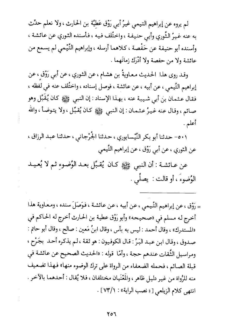 501 - حَدَّثَنَا أَبُو بَكْرٍ النَّيْسَابُورِيُّ , ثنا الْجُرْجَانِيُّ , نا عَبْدُ الرَّزَّاقِ , عَنِ الثَّوْرِيِّ , عَنْ أَبِي رَوْقٍ , عَنْ إِبْرَاهِيمَ التَّيْمِيِّ , عَنْ عَائِشَةَ , أَنَّ النَّبِيَّ صَلَّى اللهُ عَلَيْهِ وَسَلَّمَ " كَانَ §يُقَبِّلُ بَعْدَ الْوُضُوءِ , ثُمَّ لَا يُعِيدُ الْوُضُوءَ , أَوْ قَالَتْ: يُصَلِّي -[257]-