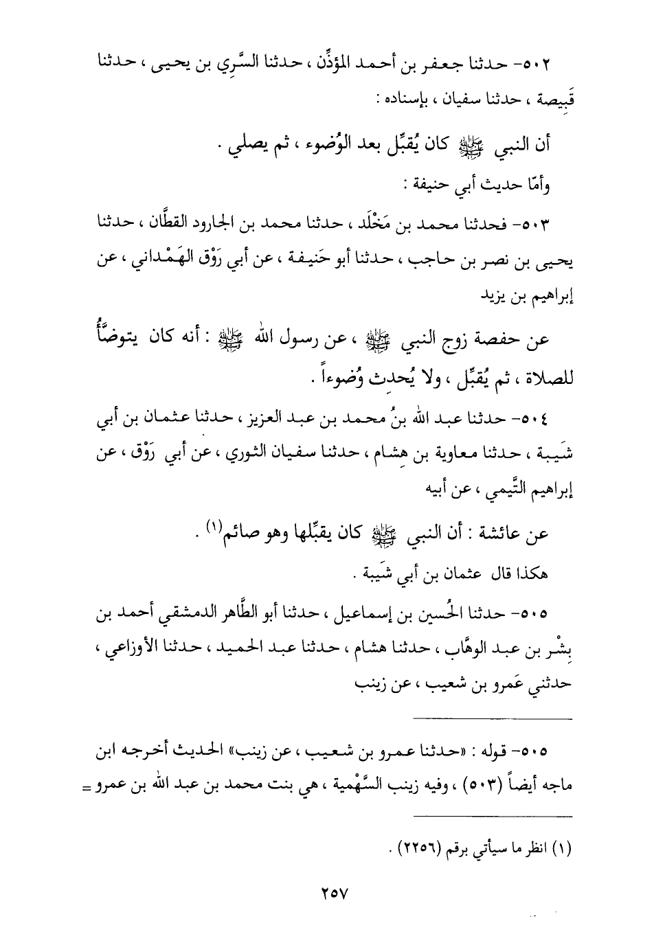 503 - فَحَدَّثَنَا مُحَمَّدُ بْنُ مَخْلَدٍ , ثنا مُحَمَّدُ بْنُ الْجَارُودِ الْقَطَّانُ , نا يَحْيَى بْنُ نَصْرِ بْنِ حَاجِبٍ , نا أَبُو حَنِيفَةَ , عَنْ أَبِي رَوْقٍ الْهَمْدَانِيِّ , عَنْ إِبْرَاهِيمَ بْنِ يَزِيدَ , عَنْ حَفْصَةَ زَوْجِ النَّبِيِّ صَلَّى اللهُ عَلَيْهِ وَسَلَّمَ , عَنْ رَسُولِ اللَّهِ صَلَّى اللهُ عَلَيْهِ وَسَلَّمَ أَنَّهُ «كَانَ §يَتَوَضَّأُ لِلصَّلَاةِ ثُمَّ يُقَبِّلُ وَلَا يُحْدِثُ وُضُوءًا»