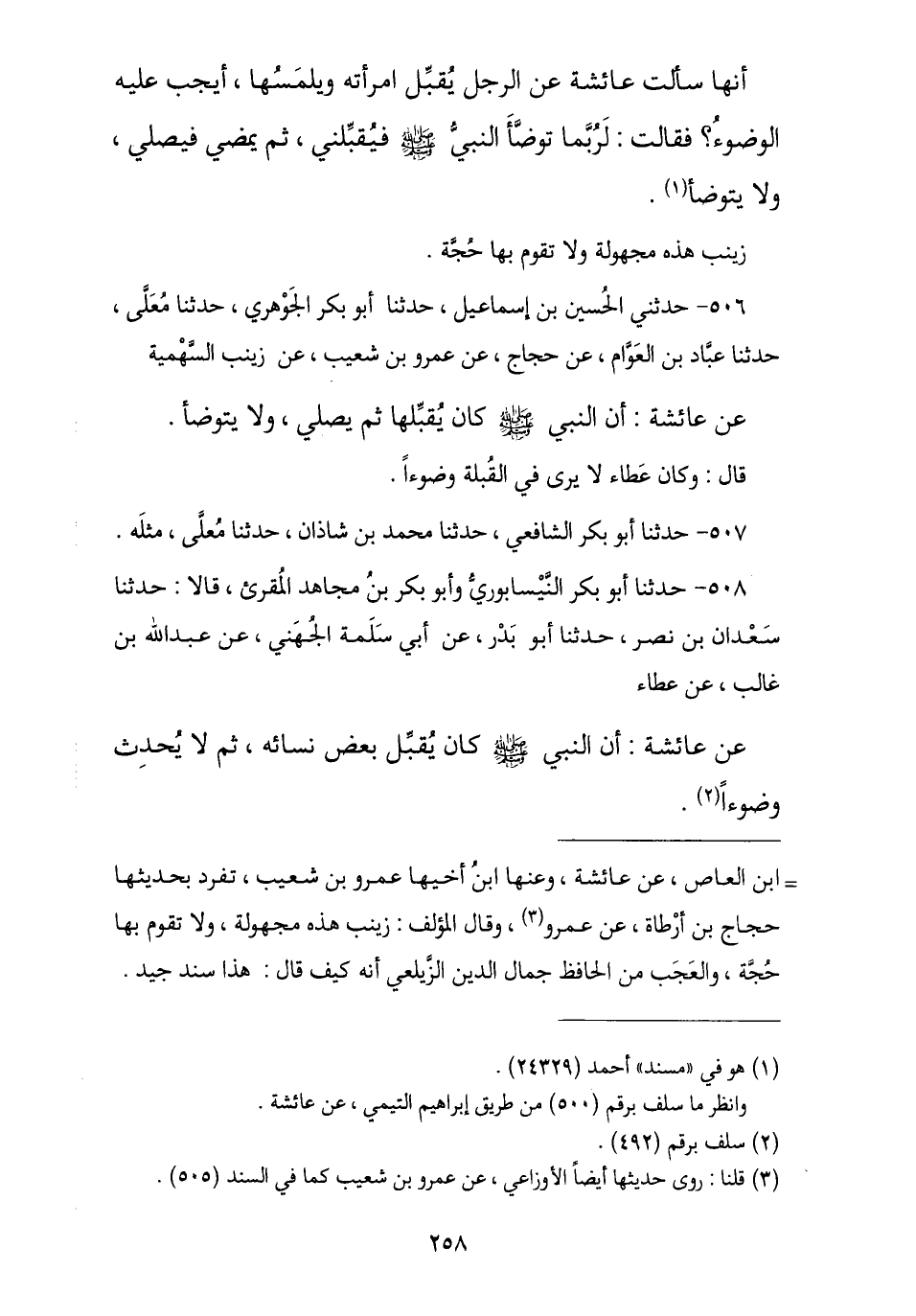 506 - حَدَّثَنِي الْحُسَيْنُ بْنُ إِسْمَاعِيلَ , نا أَبُو بَكْرٍ الْجَوْهَرِيُّ , نا مُعَلَّى بْنُ مَنْصُورٍ , نا عَبَّادُ بْنُ الْعَوَّامِ , عَنْ حَجَّاجٍ , عَنْ عَمْرِو بْنِ شُعَيْبٍ , عَنْ زَيْنَبَ السَّهْمِيَّةِ , عَنْ عَائِشَةَ , أَنَّ النَّبِيَّ صَلَّى اللهُ عَلَيْهِ وَسَلَّمَ «كَانَ §يُقَبِّلُهَا ثُمَّ يُصَلِّي وَلَا يَتَوَضَّأُ». قَالَ: وَكَانَ عَطَاءٌ لَا يَرَى فِي الْقُبْلَةِ وُضُوءًا