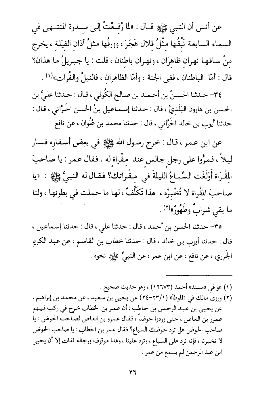 34 - حَدَّثَنَا الْحَسَنُ بْنُ أَحْمَدَ بْنِ صَالِحٍ الْكُوفِيُّ , نا عَلِيُّ بْنُ الْحَسَنِ بْنِ هَارُونَ الْبَلَدِيُّ , نا إِسْمَاعِيلُ بْنُ الْحَسَنِ الْحَرَّانِيُّ , نا أَيُّوبُ بْنُ خَالِدٍ الْحَرَّانِيُّ , نا مُحَمَّدُ بْنُ عُلْوَانَ , عَنْ نَافِعٍ , عَنِ ابْنِ عُمَرَ , قَالَ: خَرَجَ رَسُولُ اللَّهِ صَلَّى اللهُ عَلَيْهِ وَسَلَّمَ فِي بَعْضِ أَسْفَارِهِ فَسَارَ لَيْلًا , فَمَرُّوا عَلَى رَجُلٍ جَالِسٍ عِنْدَ مُقْرَاةٍ لَهُ , فَقَالَ عُمَرُ: يَا صَاحِبُ الْمُقْرَاةِ أَوَلَغَتِ السِّبَاعُ اللَّيْلَةَ فِي مُقْرَاتِكَ , فَقَالَ لَهُ النَّبِيُّ صَلَّى اللهُ عَلَيْهِ وَسَلَّمَ: «يَا صَاحِبُ الْمُقْرَاةِ لَا تُخْبِرْهُ هَذَا مُتَكَلِّفٌ §لَهَا مَا حَمَلَتْ فِي بُطُونِهَا وَلَنَا مَا بَقِيَ شَرَابٌ وَطَهُورٌ».