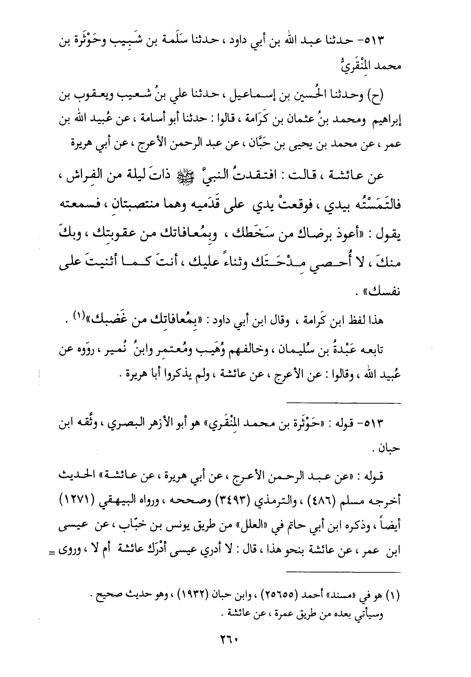 513 - حَدَّثَنَا عَبْدُ اللَّهِ بْنُ أَبِي دَاوُدَ , نا سَلَمَةُ بْنُ شَبِيبٍ , وَحَوْثَرَةُ بْنُ مُحَمَّدٍ الْمِنْقَرِيُّ , ح وَحَدَّثَنَا الْحُسَيْنُ بْنُ إِسْمَاعِيلَ , نا عَلِيُّ بْنُ شُعَيْبٍ , وَيَعْقُوبُ بْنُ إِبْرَاهِيمَ , وَمُحَمَّدُ بْنُ عُثْمَانَ بْنِ كَرَامَةَ , قَالُوا: نا أَبُو أُسَامَةَ , عَنْ عُبَيْدِ اللَّهِ بْنِ عُمَرَ , عَنْ مُحَمَّدِ بْنِ يَحْيَى بْنِ حَبَّانَ , عَنْ عَبْدِ الرَّحْمَنِ الْأَعْرَجِ , عَنْ أَبِي هُرَيْرَةَ , عَنْ عَائِشَةَ , قَالَتِ: افْتَقَدْتُ النَّبِيَّ صَلَّى اللهُ عَلَيْهِ وَسَلَّمَ ذَاتَ لَيْلَةٍ مِنَ الْفِرَاشِ , فَالْتَمَسْتُهُ بِيَدِي فَوَقَعَتْ يَدَيْ عَلَى قَدَمَيْهِ وَهُمَا مُنْتَصِبَانِ فَسَمِعْتُهُ , يَقُولُ: § «أَعُوذُ بِرِضَاكَ مِنْ سَخَطِكَ , وَبِمُعَافَاتِكَ مِنْ عُقُوبَتِكَ , وَبِكَ مِنْكَ لَا أُحْصِي مَدْحَتَكَ وَثَنَاءً عَلَيْكَ أَنْتَ كَمَا أَثْنَيْتَ عَلَى نَفْسِكَ». هَذَا لَفْظُ ابْنِ كَرَامَةَ , وَقَالَ ابْنُ أَبِي دَاوُدَ: بِمُعَافَاتِكَ مِنْ غَضَبِكَ. تَابَعَهُ عَبْدَةُ بْنُ سُلَيْمَانَ , عَنْ عُبَيْدِ اللَّهِ. وَخَالَفَهُمْ وُهَيْبٌ , وَمُعْتَمِرٌ , وَابْنُ نُمَيْرٍ , فَرَوَوْهُ عَنْ عُبَيْدِ اللَّهِ , وَقَالُوا: عَنِ الْأَعْرَجِ , عَنْ عَائِشَةَ , وَلَمْ يَذْكُرُوا أَبَا هُرَيْرَةَ
