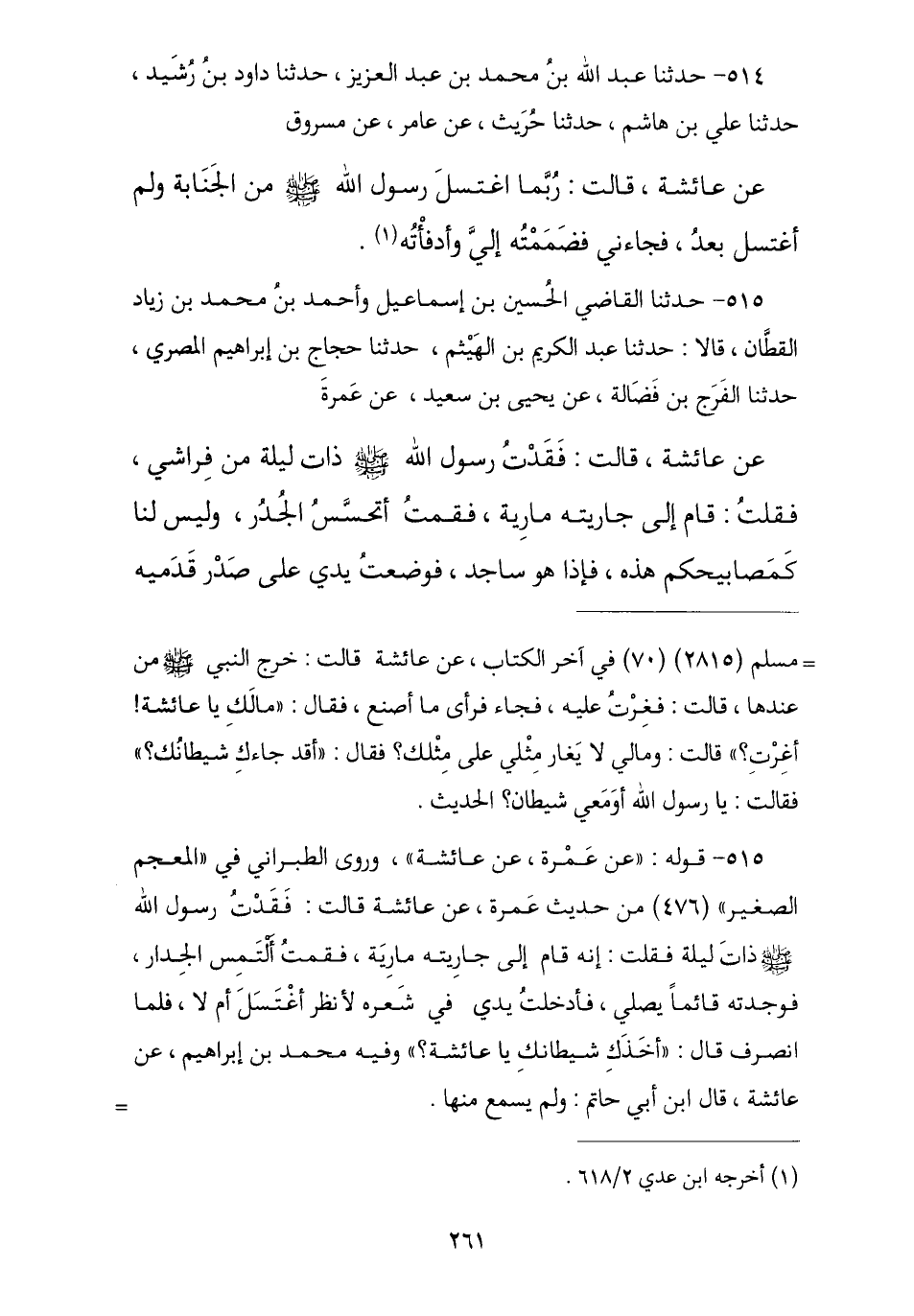 514 - أَخْبَرَنَا عَبْدُ اللَّهِ بْنُ مُحَمَّدِ بْنِ عَبْدِ الْعَزِيزِ , نا دَاوُدُ بْنُ رُشَيْدٍ , نا عَلِيُّ بْنُ هَاشِمٍ , نا حُرَيْثٌ , عَنْ عَامِرٍ , عَنْ مَسْرُوقٍ , عَنْ عَائِشَةَ , قَالَتْ: § «رُبَّمَا اغْتَسَلَ رَسُولُ اللَّهِ صَلَّى اللهُ عَلَيْهِ وَسَلَّمَ مِنَ الْجَنَابَةِ وَلَمْ أَغْتَسِلْ بَعْدُ فَجَاءَنِي فَضَمَمْتُهُ إِلَيَّ وَأَدْفَيْتُهُ»