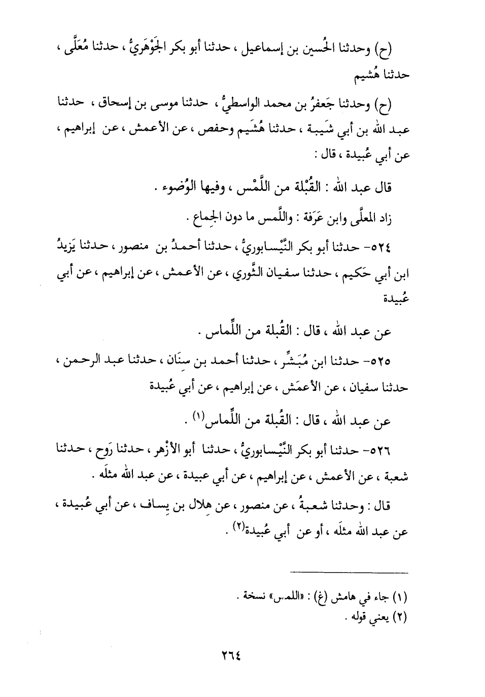524 - حَدَّثَنَا أَبُو بَكْرٍ النَّيْسَابُورِيُّ , نا أَحْمَدُ بْنُ مَنْصُورٍ , نا يَزِيدُ بْنُ أَبِي حَكِيمٍ , نا سُفْيَانُ الثَّوْرِيُّ , عَنِ الْأَعْمَشِ , عَنْ إِبْرَاهِيمَ , عَنْ أَبِي عُبَيْدَةَ , عَنْ عَبْدِ اللَّهِ , قَالَ: § «الْقُبْلَةُ مِنَ اللِّمَاسِ». صَحِيحٌ