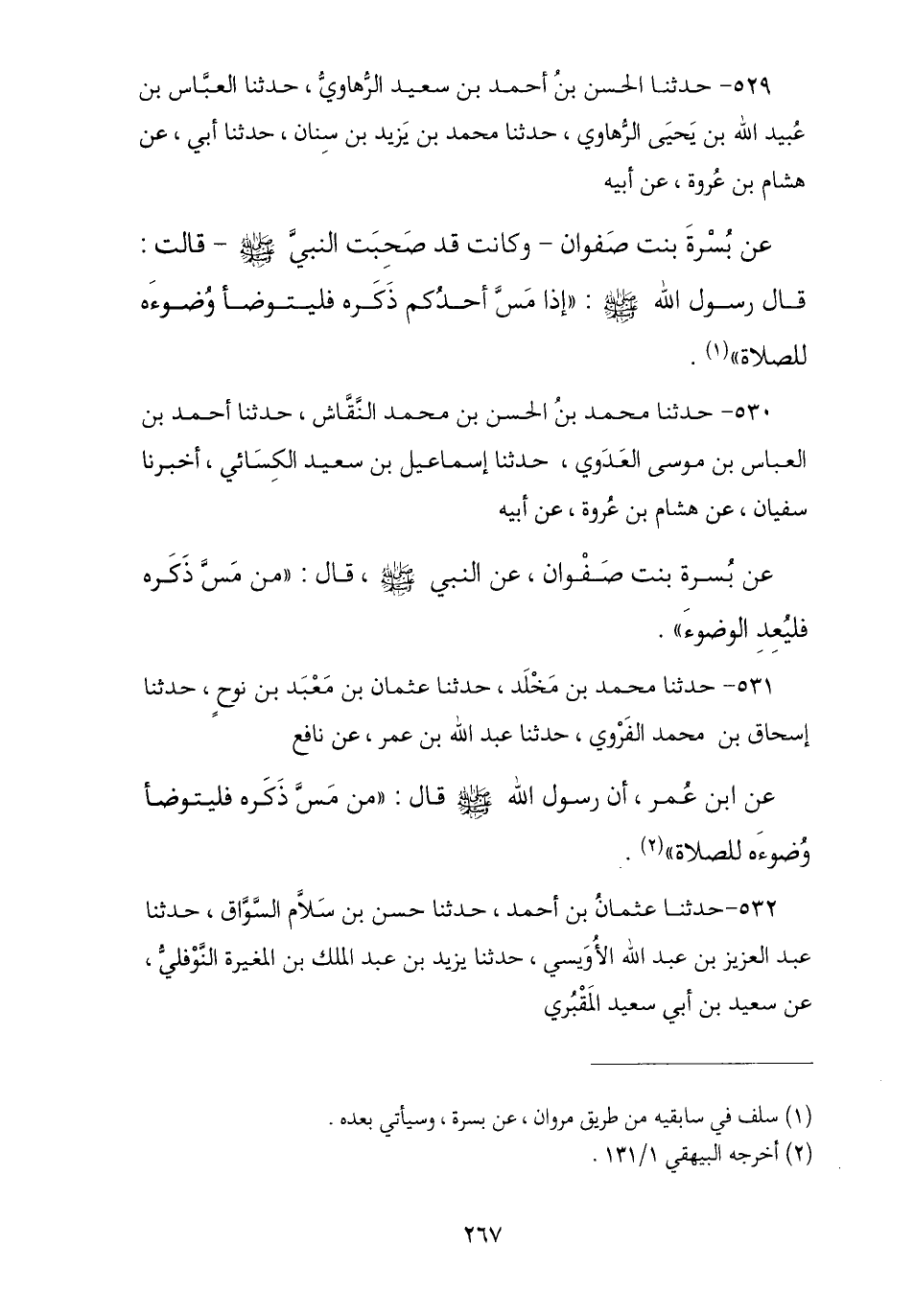 529 - حَدَّثَنَا الْحَسَنُ بْنُ أَحْمَدَ بْنِ سَعِيدٍ الرَّهَاوِيُّ , ثنا الْعَبَّاسُ بْنُ عُبَيْدِ اللَّهِ بْنِ يَحْيَى الرَّهَاوِيُّ , نا مُحَمَّدُ بْنُ يَزِيدَ بْنِ سِنَانٍ , نا أَبِي , عَنْ هِشَامِ بْنِ عُرْوَةَ , عَنْ أَبِيهِ , عَنْ مَرْوَانَ , عَنْ بُسْرَةَ بِنْتِ صَفْوَانَ , وَكَانَتْ قَدْ صَحِبَتِ النَّبِيَّ صَلَّى اللهُ عَلَيْهِ وَسَلَّمَ , قَالَتْ: قَالَ رَسُولُ اللَّهِ صَلَّى اللهُ عَلَيْهِ وَسَلَّمَ: § «إِذَا مَسَّ أَحَدُكُمْ ذَكَرَهُ فَلْيَتَوَضَّأْ وُضُوءَهُ لِلصَّلَاةِ»