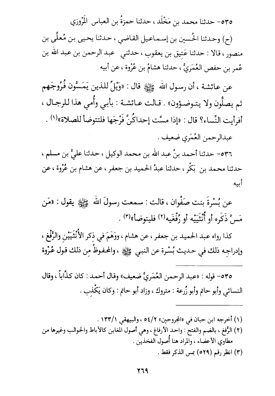 535 - حَدَّثَنَا مُحَمَّدُ بْنُ مَخْلَدٍ , نا حَمْزَةُ بْنُ الْعَبَّاسِ الْمَرْوَزِيُّ , ح وَحَدَّثَنَا الْحُسَيْنُ بْنُ إِسْمَاعِيلَ , نا يَحْيَى بْنُ مُعَلَّى بْنِ مَنْصُورٍ , قَالَا: نا عَتِيقُ بْنُ يَعْقُوبَ , حَدَّثَنِي عَبْدُ الرَّحْمَنِ بْنُ عَبْدِ اللَّهِ بْنِ عُمَرَ بْنِ حَفْصٍ الْعُمَرِيُّ , عَنْ هِشَامِ بْنِ عُرْوَةَ , عَنْ أَبِيهِ , عَنْ عَائِشَةَ , أَنَّ رَسُولَ اللَّهِ صَلَّى اللهُ عَلَيْهِ وَسَلَّمَ , قَالَ: § «وَيْلٌ لِلَّذِينَ يَمَسُّونَ فُرُوجَهُمْ ثُمَّ يُصَلُّونَ وَلَا يَتَوَضَّئُونَ». قَالَتْ عَائِشَةُ: بِأَبِي وَأُمِّي هَذَا لِلرِّجَالِ أَفَرَأَيْتَ النِّسَاءَ؟ , قَالَ: «إِذَا مَسَّتْ إِحْدَاكُنَّ فَرْجَهَا فَلْتَتَوَضَّأْ لِلصَّلَاةِ». عَبْدُ الرَّحْمَنِ الْعُمَرِيُّ ضَعِيفٌ