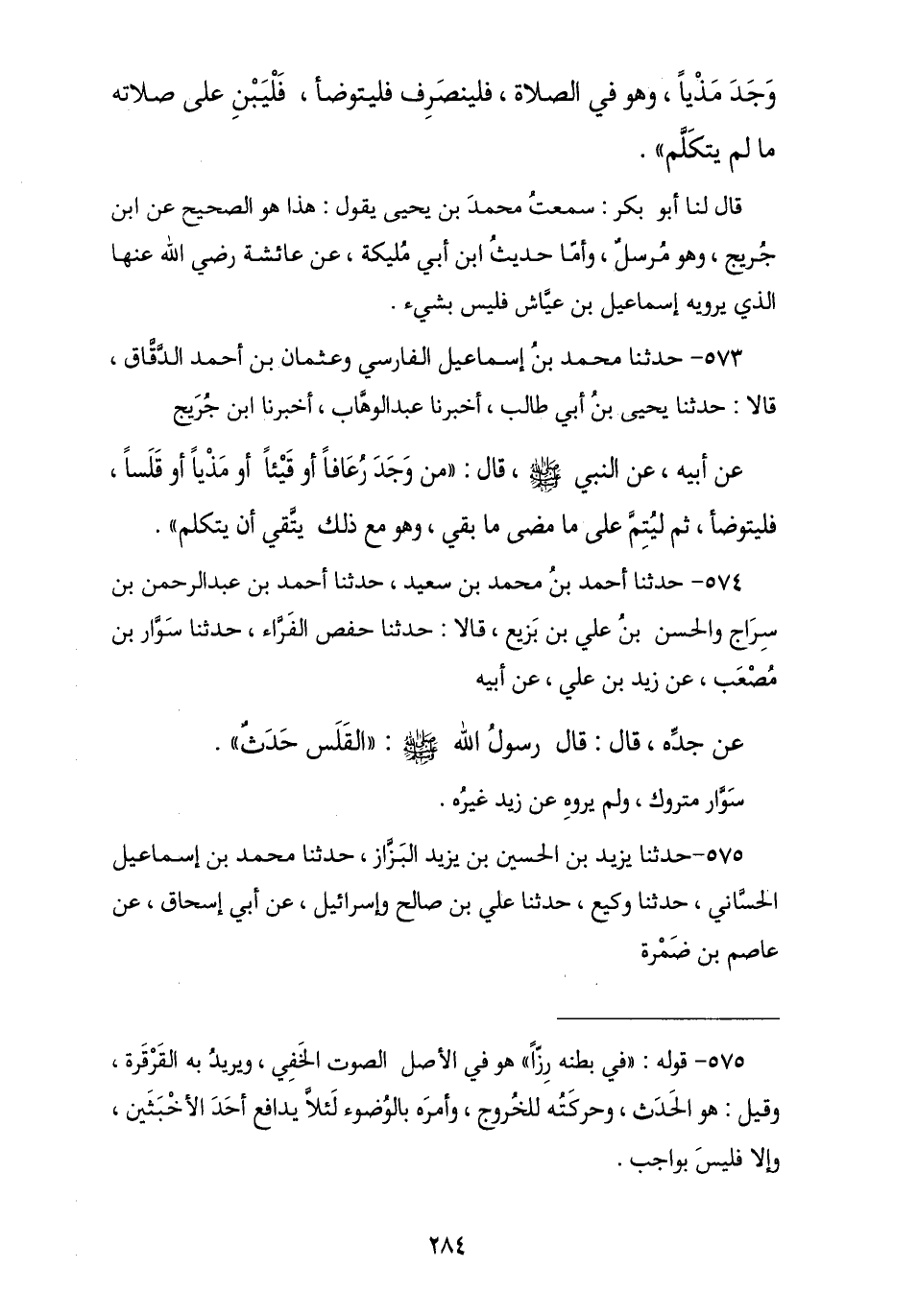 573 - حَدَّثَنَا مُحَمَّدُ بْنُ إِسْمَاعِيلَ الْفَارِسِيُّ , وَعُثْمَانُ بْنُ أَحْمَدَ الدَّقَّاقُ , قَالَا: نا يَحْيَى بْنُ أَبِي طَالِبٍ , نا عَبْدُ الْوَهَّابِ , أنا ابْنُ جُرَيْجٍ , عَنْ أَبِيهِ , عَنِ النَّبِيِّ صَلَّى اللهُ عَلَيْهِ وَسَلَّمَ قَالَ: § «مَنْ وَجَدَ رُعَافًا , أَوْ قَيْئًا , أَوْ مَذْيًا , أَوْ قَلْسًا فَلْيَتَوَضَّأْ ثُمَّ لِيُتِمَّ عَلَى مَا مَضَى مَا بَقِيَ وَهُوَ مَعَ ذَلِكَ يَتَّقِيَ أَنْ يَتَكَلَّمَ»