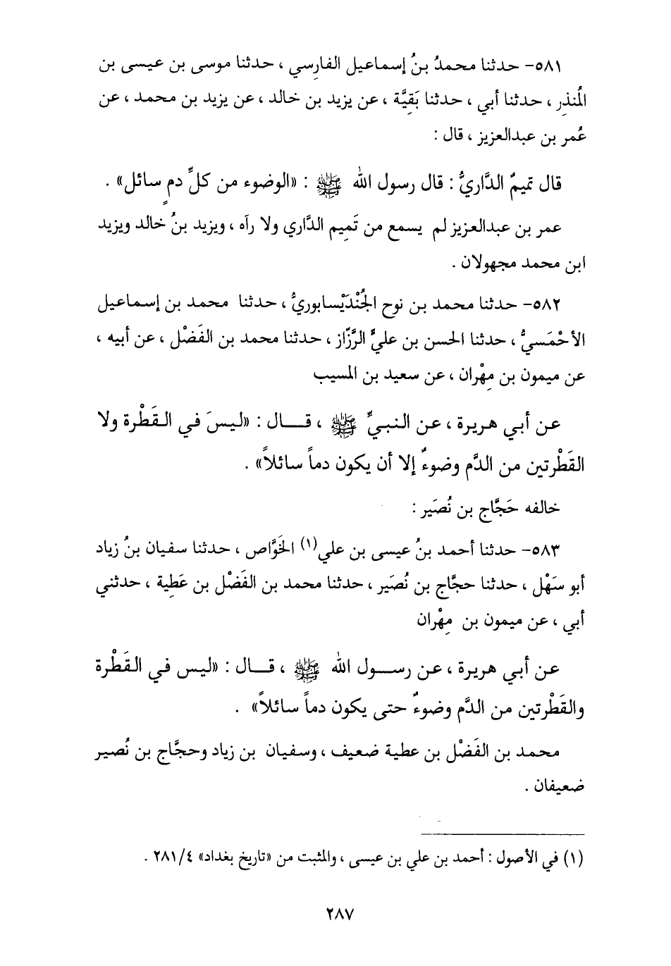 581 - حَدَّثَنَا مُحَمَّدُ بْنُ إِسْمَاعِيلَ الْفَارِسِيُّ , نا مُوسَى بْنُ عِيسَى بْنِ الْمُنْذِرِ , نا أَبِي , نا بَقِيَّةُ , عَنْ يَزِيدَ بْنِ خَالِدٍ , عَنْ يَزِيدَ بْنِ مُحَمَّدٍ , عَنْ عُمَرَ بْنِ عَبْدِ الْعَزِيزِ , قَالَ: قَالَ تَمِيمٌ الدَّارِيُّ: قَالَ رَسُولُ اللَّهِ صَلَّى اللهُ عَلَيْهِ وَسَلَّمَ: § «الْوُضُوءُ مِنْ كُلِّ دَمٍ سَائِلٍ». عُمَرُ بْنُ عَبْدِ الْعَزِيزِ لَمْ يَسْمَعْ مِنْ تَمِيمٍ الدَّارِيِّ وَلَا رَآهُ , وَيَزِيدُ بْنُ خَالِدٍ , وَيَزِيدُ بْنُ مُحَمَّدٍ مَجْهُولَانِ
