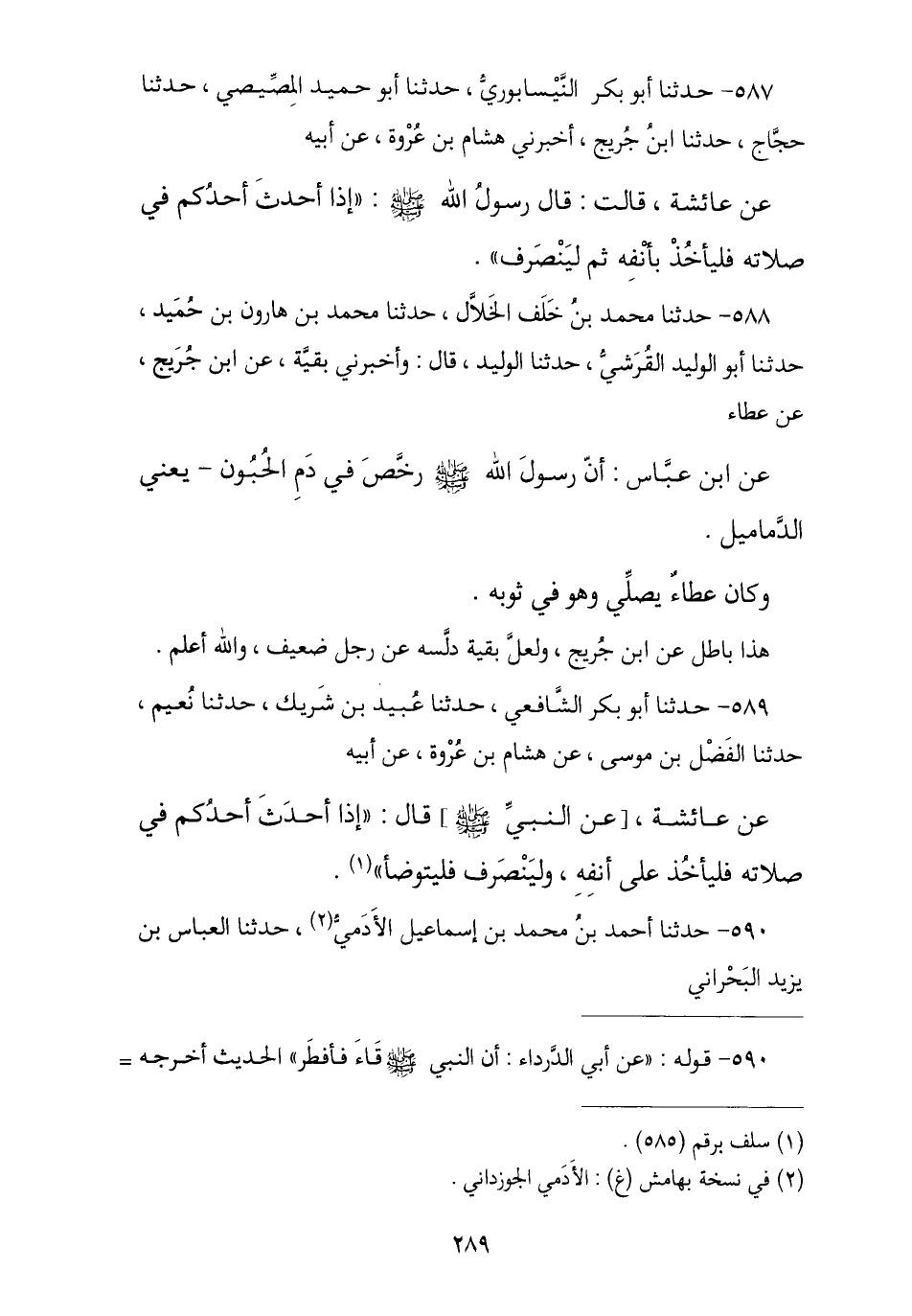 589 - حَدَّثَنَا أَبُو بَكْرٍ الشَّافِعِيُّ , نا عُبَيْدُ بْنُ شَرِيكٍ , نا نُعَيْمٌ , نا الْفَضْلُ بْنُ مُوسَى , عَنْ هِشَامِ بْنِ عُرْوَةَ , عَنْ أَبِيهِ , عَنْ عَائِشَةَ , عَنِ النَّبِيِّ صَلَّى اللهُ عَلَيْهِ وَسَلَّمَ قَالَ: § «إِذَا أَحْدَثَ أَحَدُكُمْ فِي صَلَاتِهِ فَلْيَأْخُذْ عَلَى أَنْفِهِ وَلْيَنْصَرِفْ فَلْيَتَوَضَّأْ»