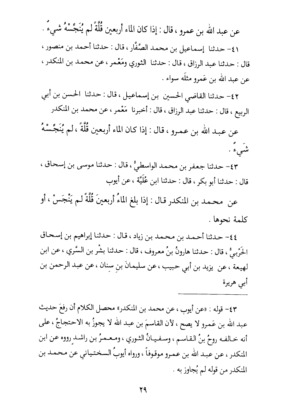 42 - حَدَّثَنَا الْقَاضِي الْحُسَيْنُ بْنُ إِسْمَاعِيلَ , نا الْحَسَنُ بْنُ أَبِي الرَّبِيعِ , نا عَبْدُ الرَّزَّاقِ , أنا مَعْمَرٌ , عَنْ مُحَمَّدِ بْنِ الْمُنْكَدِرِ , عَنْ عَبْدِ اللَّهِ بْنِ عَمْرٍو , قَالَ: § «إِذَا كَانَ الْمَاءُ أَرْبَعِينَ قُلَّةً لَمْ يُنَجِّسْهٌ شَيْءٌ»