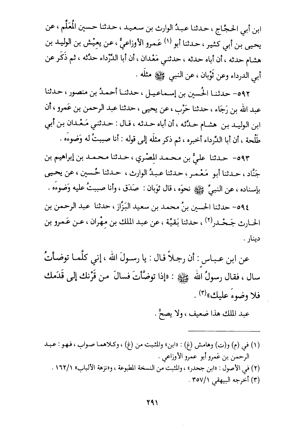 594 - حَدَّثَنَا الْحُسَيْنُ بْنُ مُحَمَّدِ بْنِ سَعِيدٍ الْبَزَّازُ , نا عَبْدُ الرَّحْمَنِ بْنُ الْحَارِثِ جَحْدَرٌ , نا بَقِيَّةُ , عَنْ عَبْدِ الْمَلِكِ بْنِ مِهْرَانَ , عَنْ عَمْرِو بْنِ دِينَارٍ , عَنِ ابْنِ عَبَّاسٍ , أَنَّ رَجُلًا قَالَ: يَا رَسُولَ اللَّهِ إِنِّي كُلَّمَا تَوَضَّأْتُ سَالَ؟ , فَقَالَ رَسُولُ اللَّهِ صَلَّى اللهُ عَلَيْهِ وَسَلَّمَ: § «إِذَا تَوَضَّأْتَ فَسَالَ مِنْ قَرْنِكَ إِلَى قَدَمَيْكَ فَلَا وُضُوءَ عَلَيْكَ». عَبْدُ الْمَلِكِ هَذَا ضَعِيفٌ وَلَا يَصِحُّ